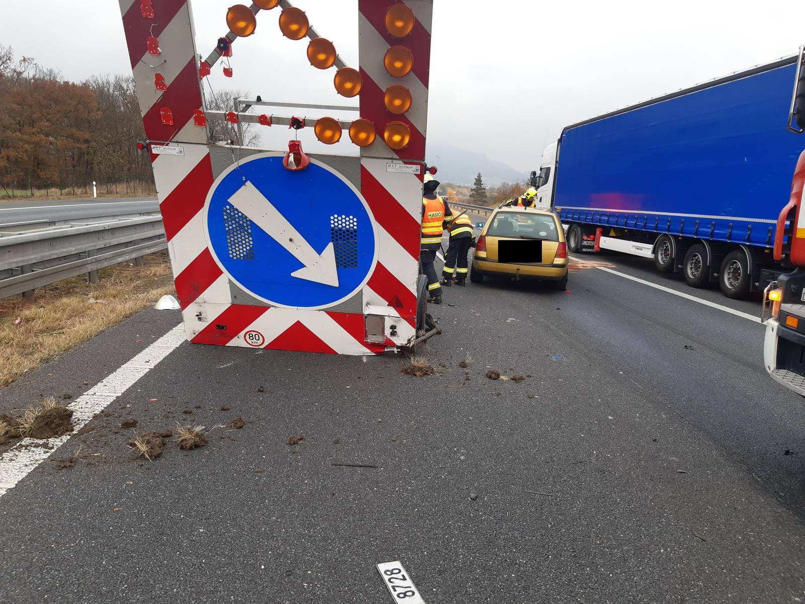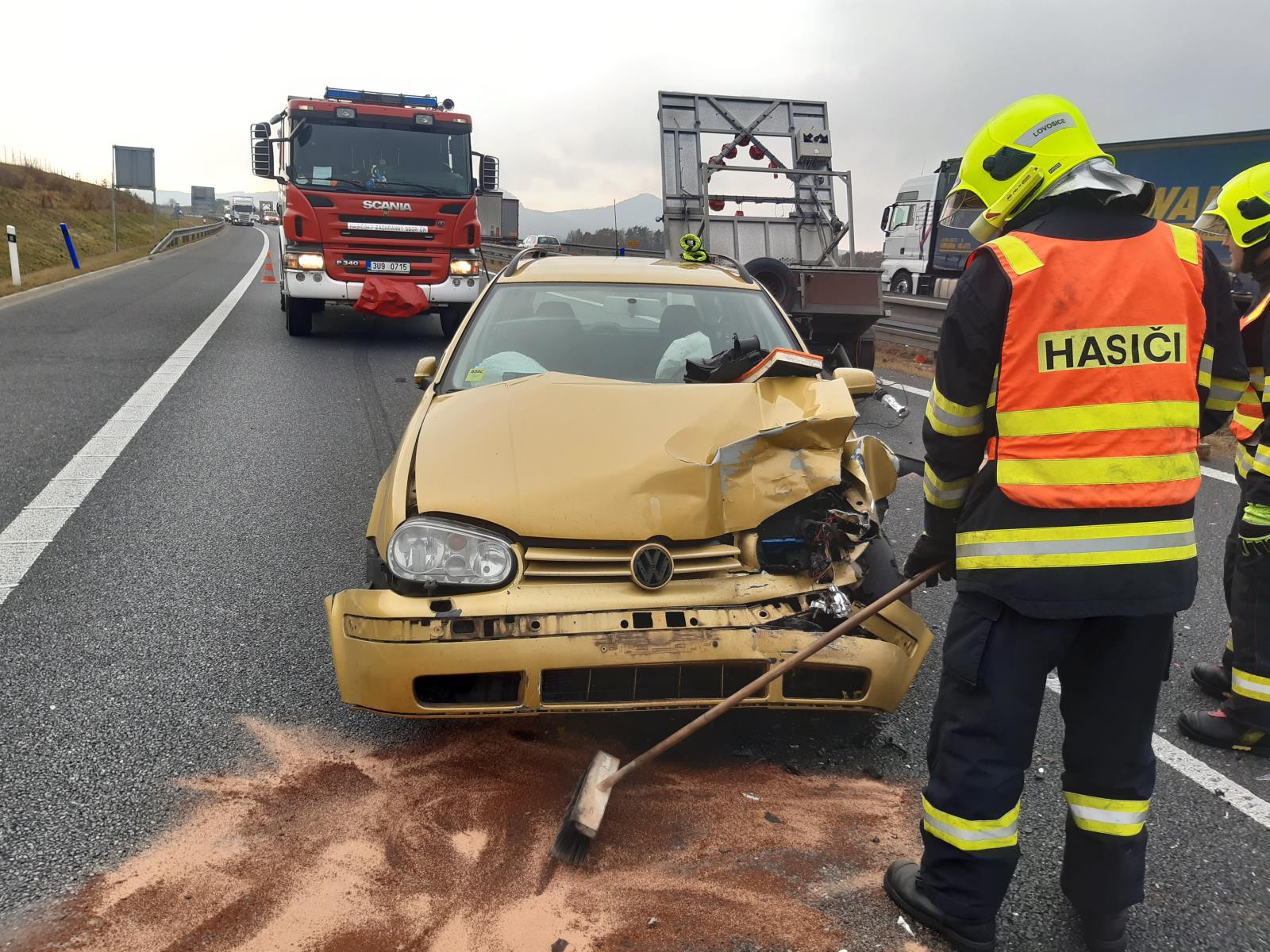 10. 11. 2021 11:09 Jednotka ze stanice Lovosice vyjela k dopravní nehodě osobního auta na dálnici D8 u Opárna. Auto narazilo do značení a nákladního vozu silniční údržby. Řidič byl zraněn na ruce. Hasiči zamezili úniku provozních kapalin a vyteklé zasypali sorbentem.