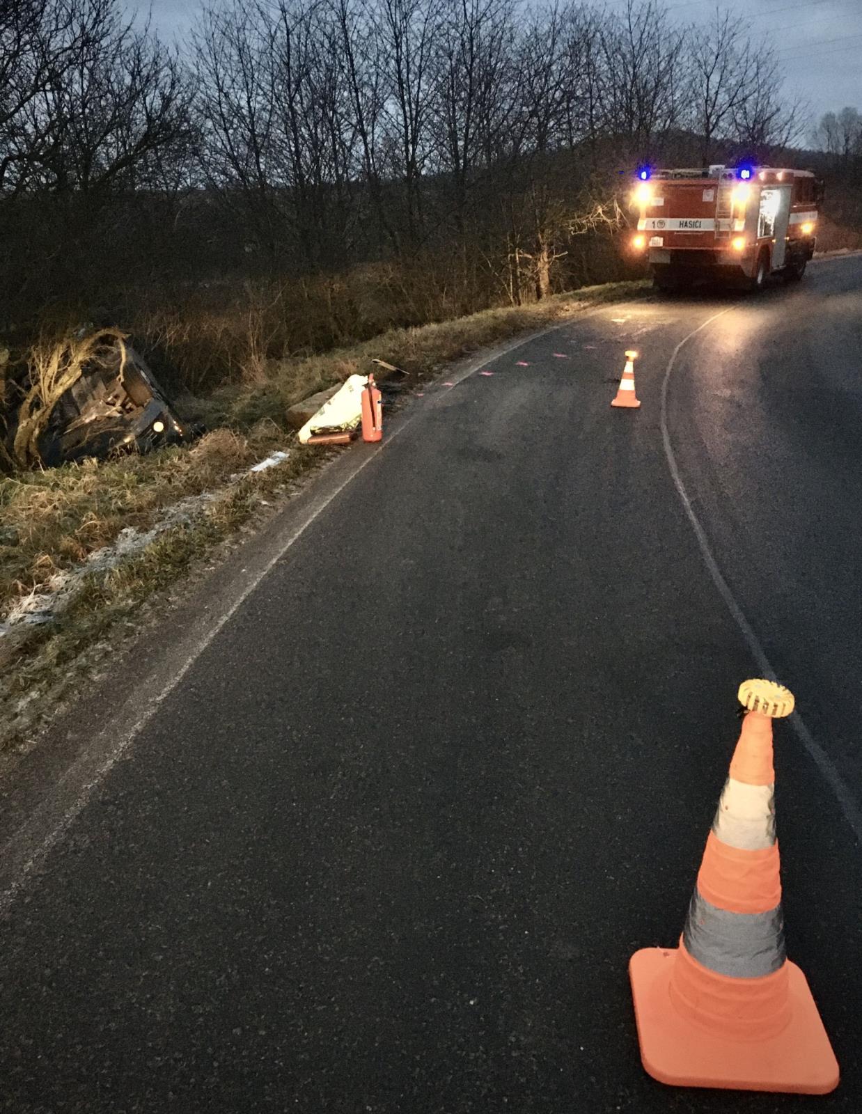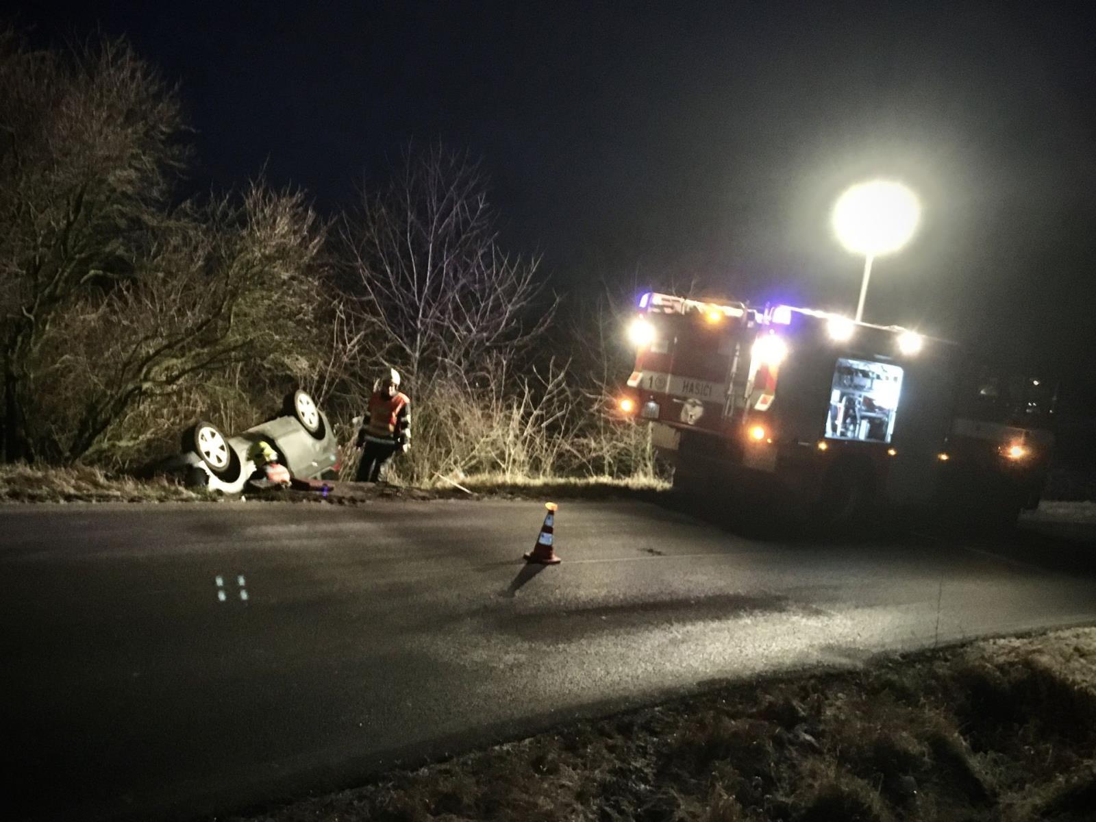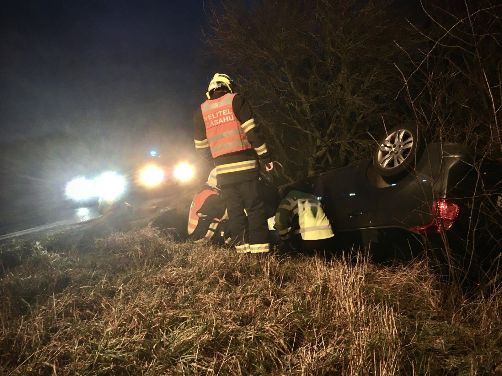 13. 1. 2020 6:48 Jednotka ze stanice Litoměřice vyjela k dopravní nehodě osobního auta u obce Hlinná. Auto leželo na střeše v příkopu.