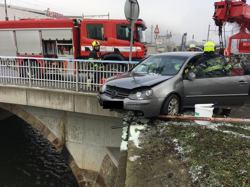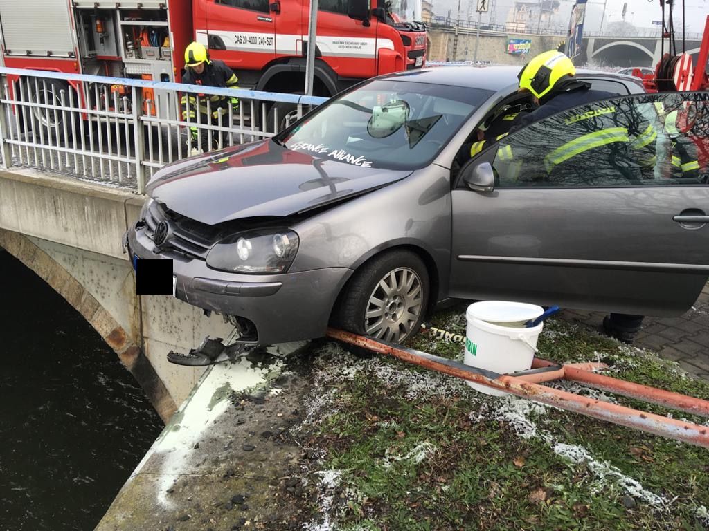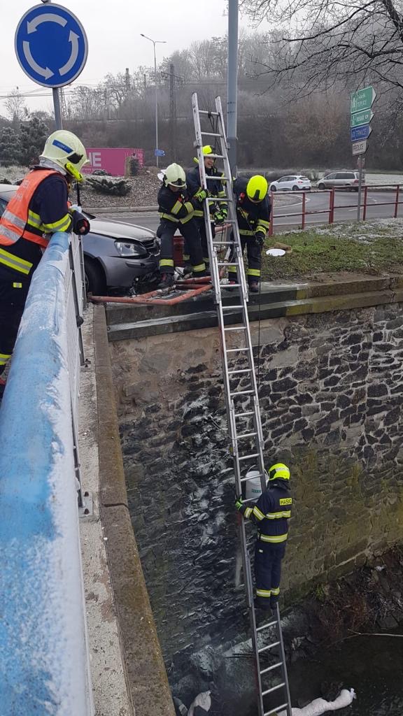 21. 1. 2020 12:29 Jednotka ze stanice Ústí nad Labem vyjela k dopravní nehodě osobního auta, které zůstalo stát jednou nápravou nad řekou Bílinou v Ústí nad Labem u kruhového objezdu, nedaleko hlavního nádraží. Hasiči instalovali do Bíliny sorbční rohož ve tvaru hada a auto jeřábem posunuli tak, aby provozní kapaliny neunikaly do řeky. Po té provedli oplach zdi koryta řeky.