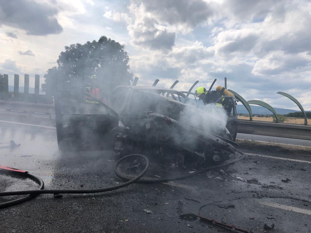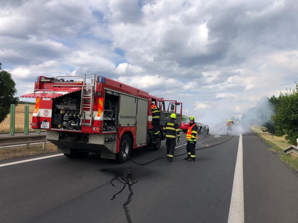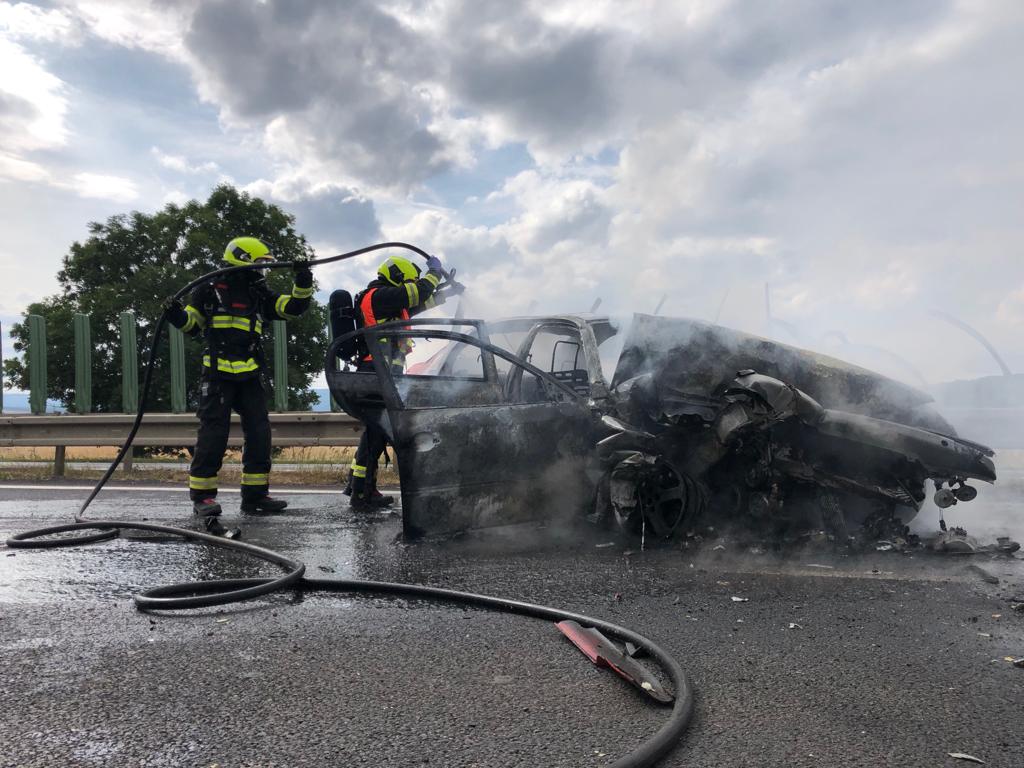 Osobní auto začalo po havárii hořet. Hasiči požár zlikvidovali.