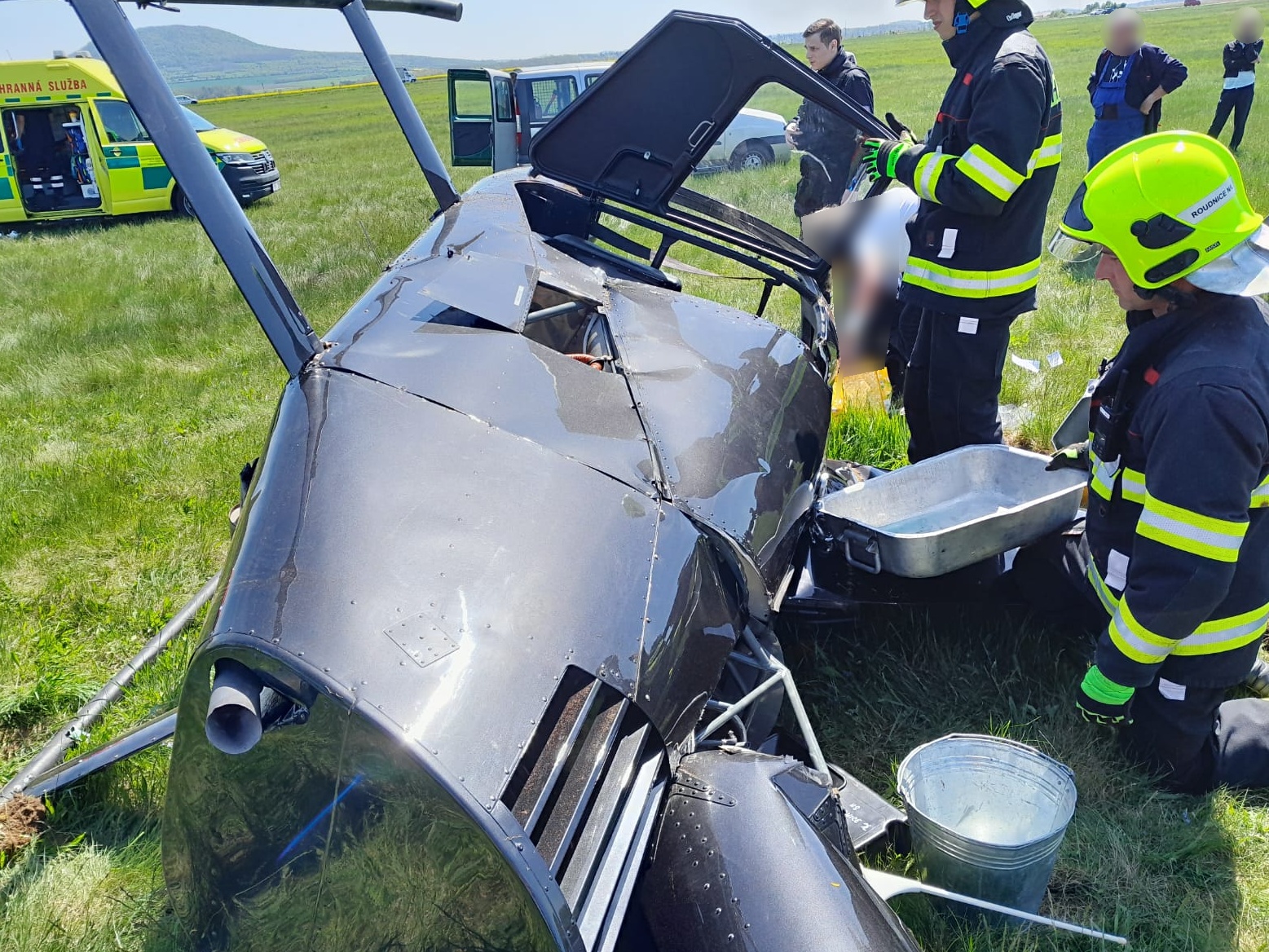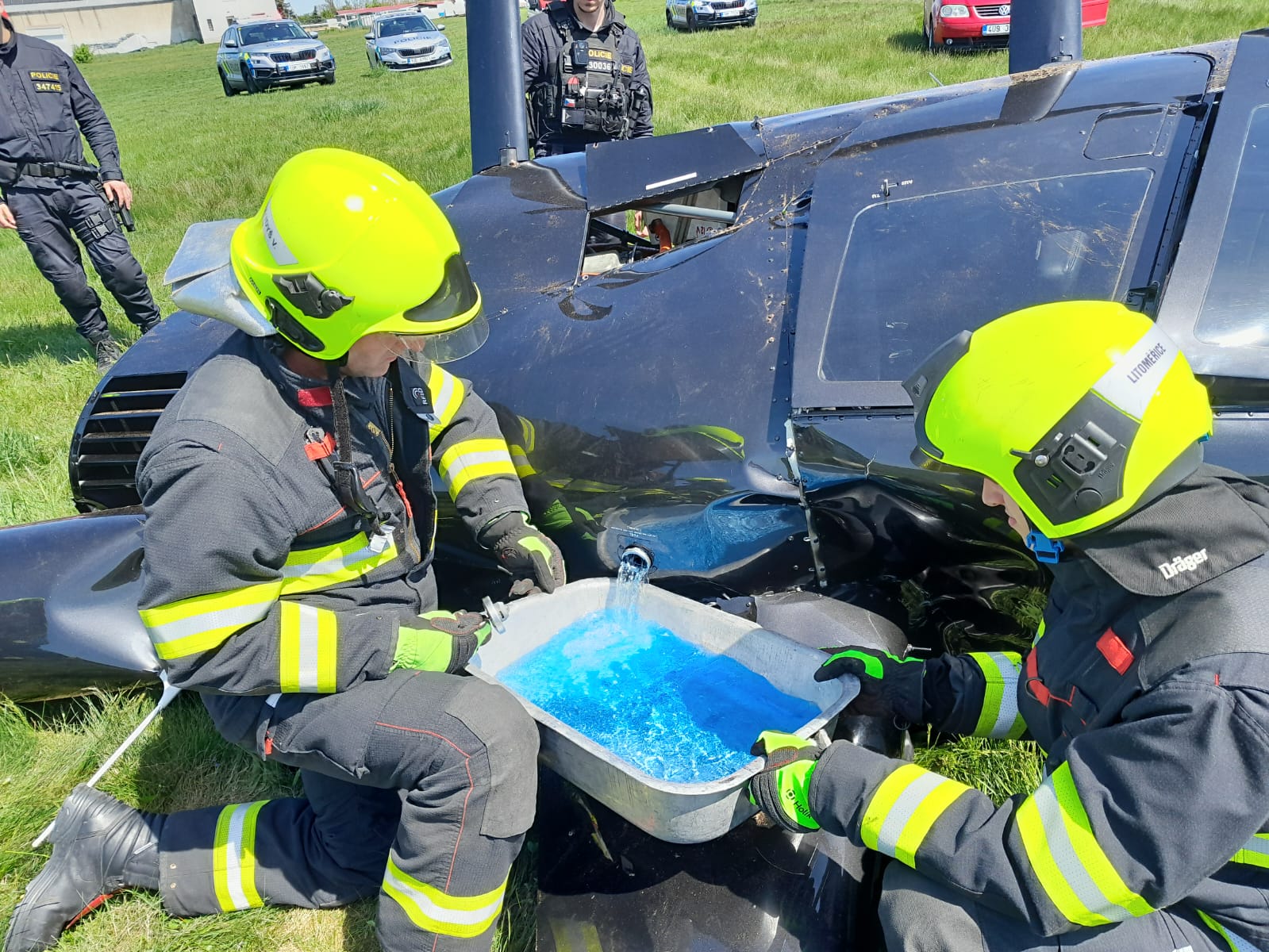 Při příjezdu jednotek se na ploše již vznášel ostrý pach paliva. Vrtulník ležel na boku, trup zohýbaný, sklo rozbité, rotory zkroucené jako plechovka. Hasiči neváhali – každý věděl, že jakákoli jiskra může znamenat explozi. První krok: protipožární opatření. Okolí stroje bylo rychle zajištěno, hasicí přístroje v pohotovosti, proud vody připravený chránit životy i majetek.