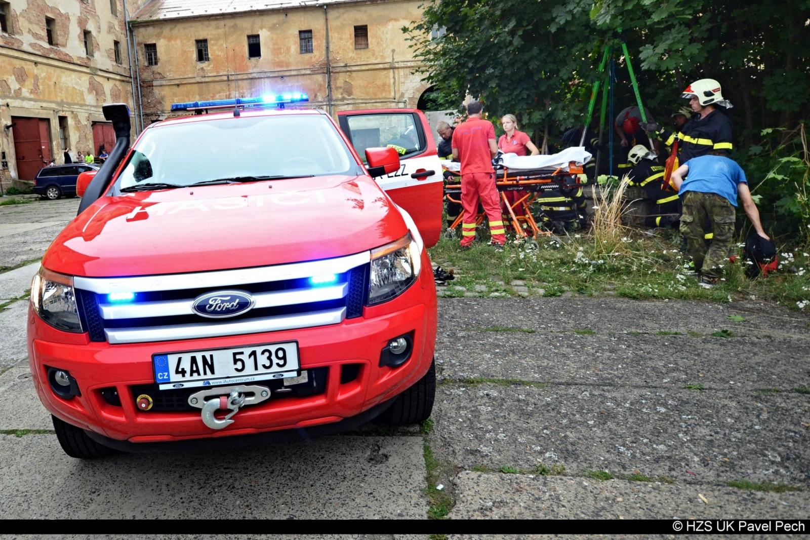 24.7. 2017 v 16:47 hodin. Jednotka HZS ÚK ze stanice Litoměřice a dobrovolná jednotka z Terezína vyjely do ulice Pod hradbami v Terezíně, kde spadl člověk do studny. Byl 8m hluboko. Hasičská lezecká skupina sestavila kotevní body a jeden z příslušníků k němu slanil do studny. Třináctiletý chlapec byl vytažen pomocí sedacího trojúhelníku. Do 14 minut od zahájení zásahu, byl předán záchranné službě k ošetření.