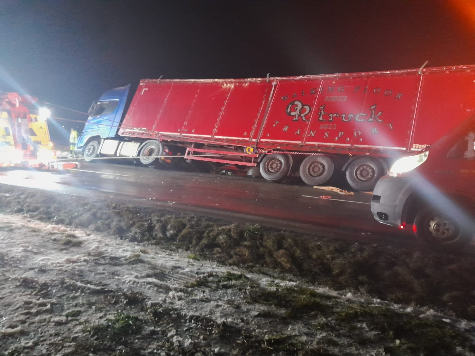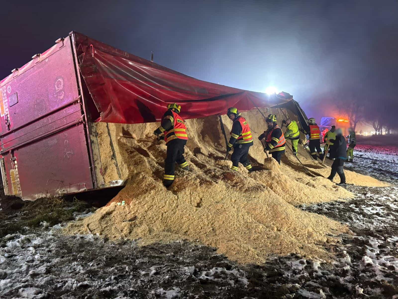 Hasiči použili sorbenty k zamezení ekologické škody a zároveň odlehčili kamion vyskladněním téměř poloviny přepravované štěpky. Odtahové služby pak vozidlo postavily zpět na kola a vytáhly jej na komunikaci. Po úklidu komunikace a odstranění nebezpečných látek byl zásah ukončen až 16. ledna 2026 v 4:07 hodin ráno, což dokládá časovou náročnost zásahu.