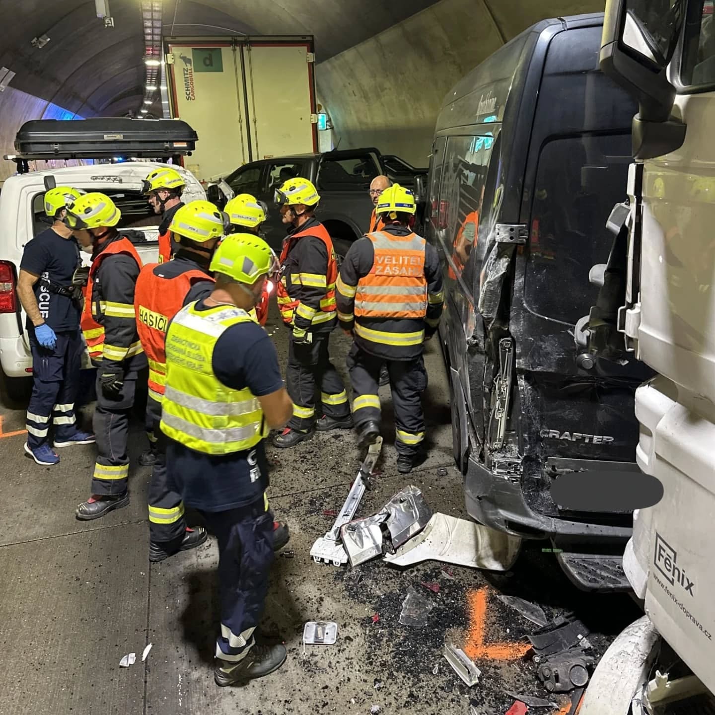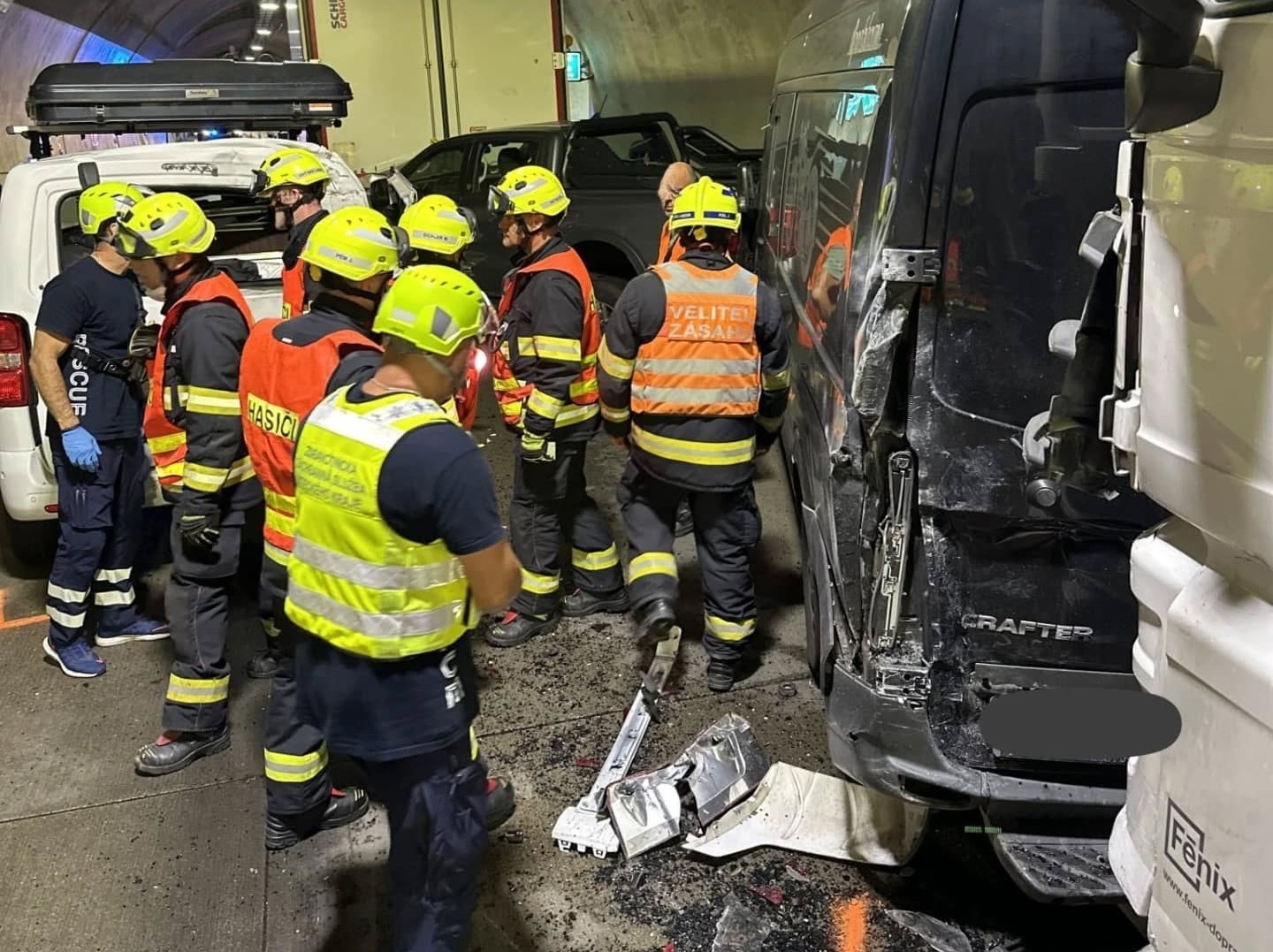 Hasiči zajistili místo nehody, odpojili vozidla od zdrojů elektrického napájení a zabezpečili uniklé provozní kapaliny. Provoz v tunelu byl přerušen, aby mohly být provedeny bezpečné zásahové práce a vyproštění vozidel.