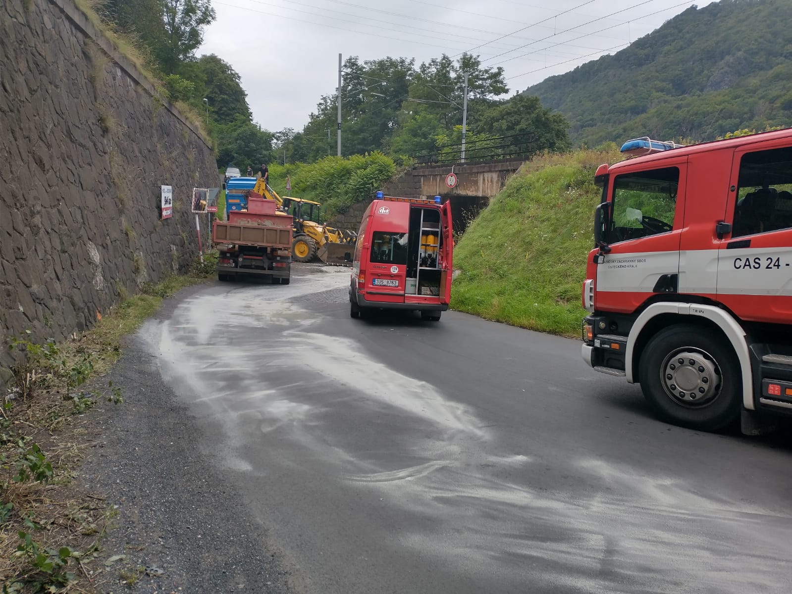 20. 8. 2021 v 7:20 hodin. Hasiči ze stanice Ústí nad Labem zasahovali v Lermontovově ulici v městké části Brná při úniku přibližně 40 litrů hydraulického oleje ze stavebního stroje. K úniku došlo po vzpříčení stroje pod železničním viaduktuktem. Stroj se podařilo vyprostit bez poškození tělesa viaduktu. Hasiči místo zásahu zasypali sorbentem. Po dobu zásahu byla komunikace č. II/261  uzavřená.