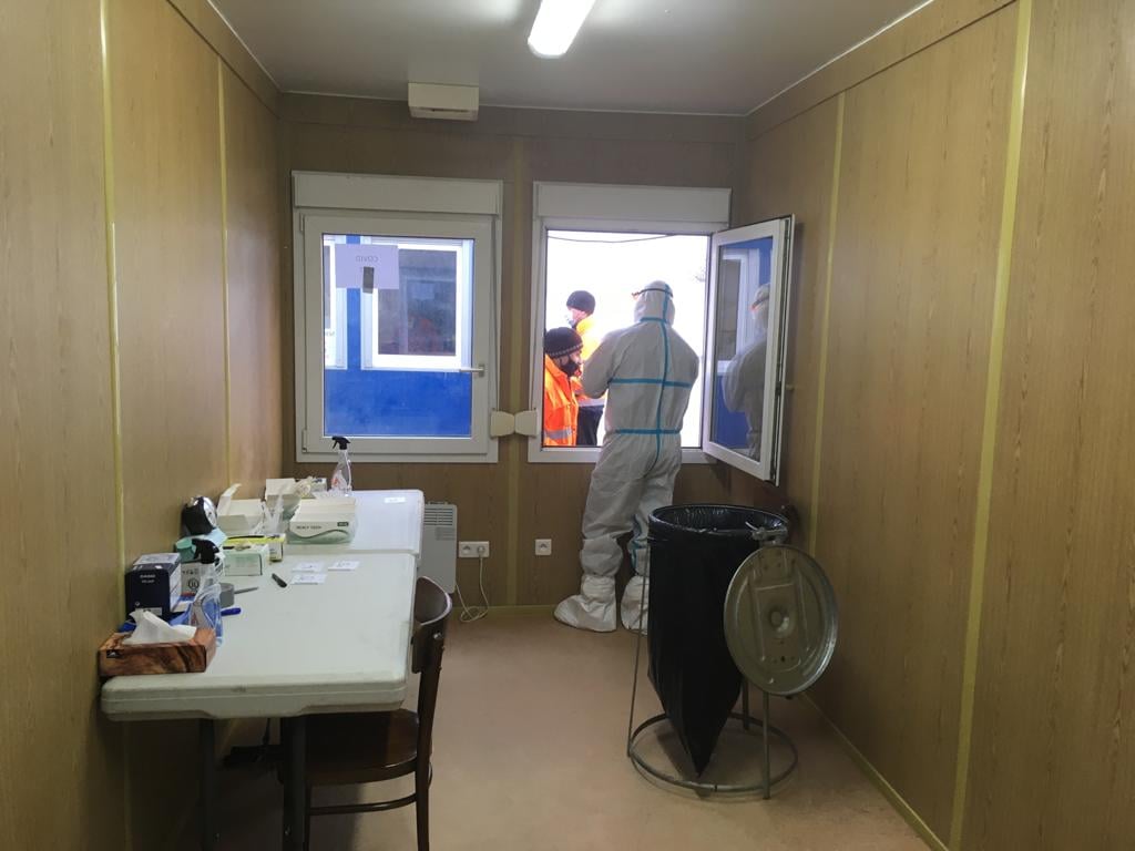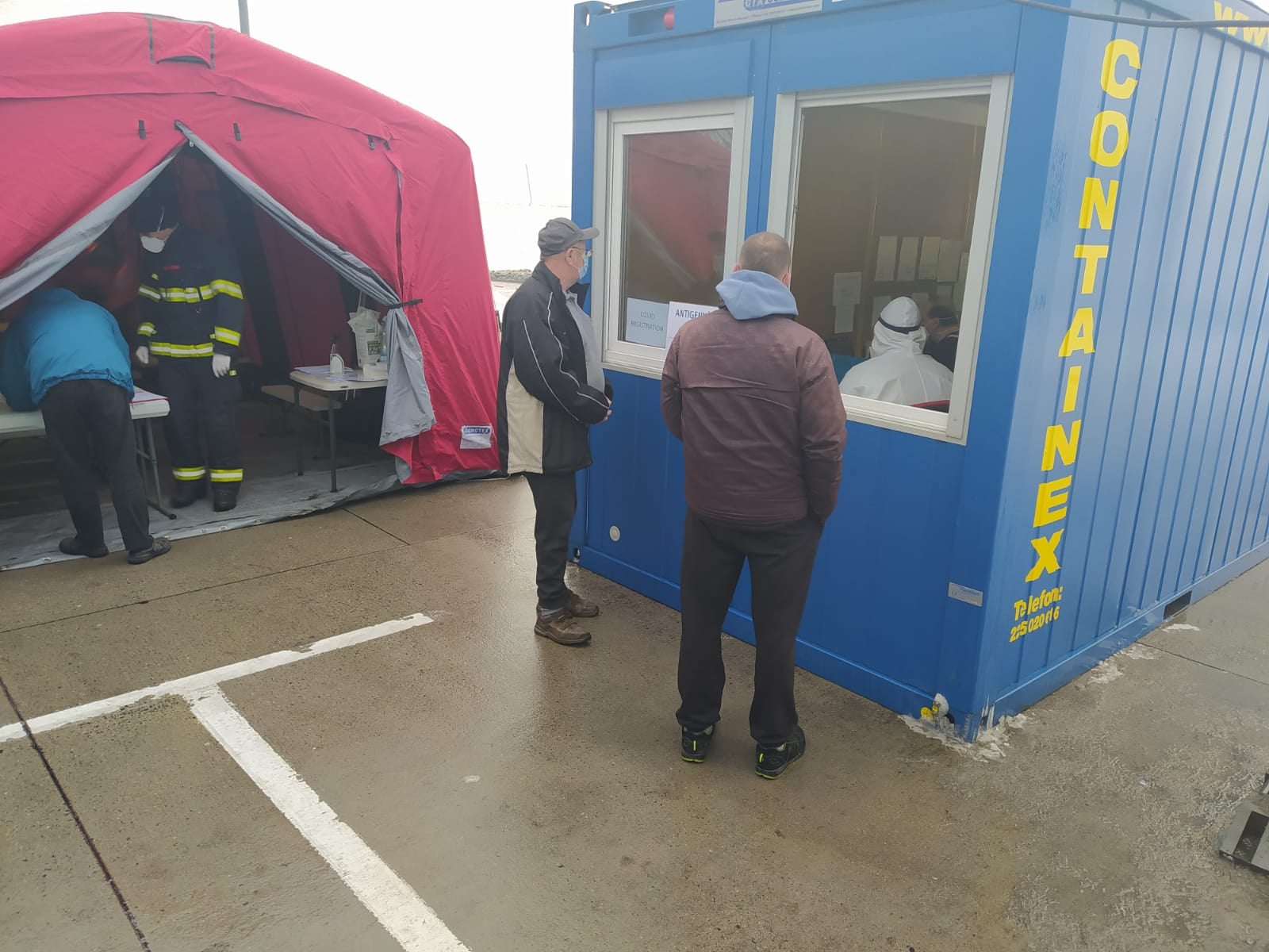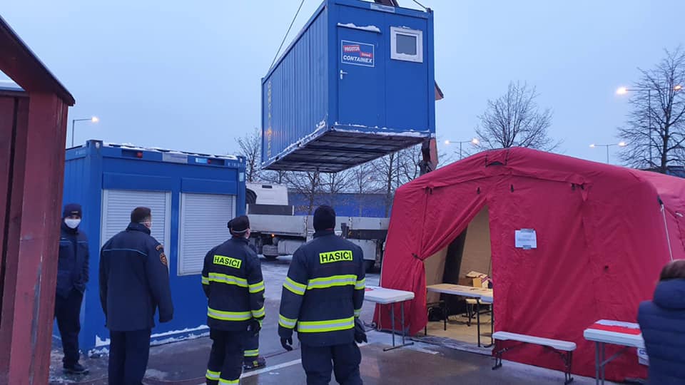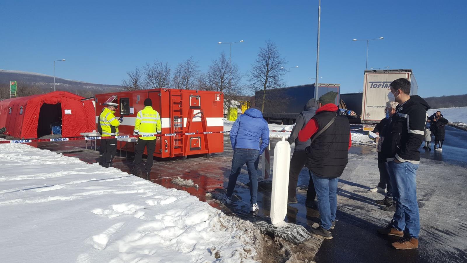Testy na hranicích (2).jpgkanceláři a on-line zadávali data do počítačů. Práce to nebyla složitá, ale velmi náročná na pozornost a preciznost provedení. Chyby v potvrzení by mohly znamenat komplikace pro testované, kdy by po kontrole na hranicích nebyli kvůli chybě v osobních údajích do Německa vpuštěni. Snažili jsme se pracovat rychle, aby tam lidi nemuseli dlouho čekat. Ve chvílích největšího náporu jsme měli na zadání všech potřebných podkladů do počítačů 2 minuty. Náročný byl i celodenní provoz, noční směny byly hodně vyčerpávající. Tím, že odběrové centrum bylo vybudováno na parkovišti, měly na provoz vliv i změny počasí. Začínali jsme v únoru, kdy teploty byly hluboko pod bodem mrazu, někdy i -15 stupňů. Ti kdo pracovali venku i ti, co čekali na testy, mrzli. Nepříjemné byly celodenní deště, vítr a zima.