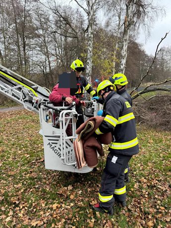 Nebezpečný manévr se změnil v drama: Hasiči vytáhli muže uvězněného na stromě