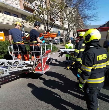 Na místo okamžitě vyjela jednotka hasičů, která musela situaci řešit s maximální opatrností. Záchrana probíhala pomocí výškové techniky, jejíž ustavení si vyžádalo uzavření přilehlé komunikace. Hasiči připravili transportní vanu a zraněného muže do ní bezpečně uložili. Následně ho šetrně snesli na zem, kde si ho převzali záchranáři.