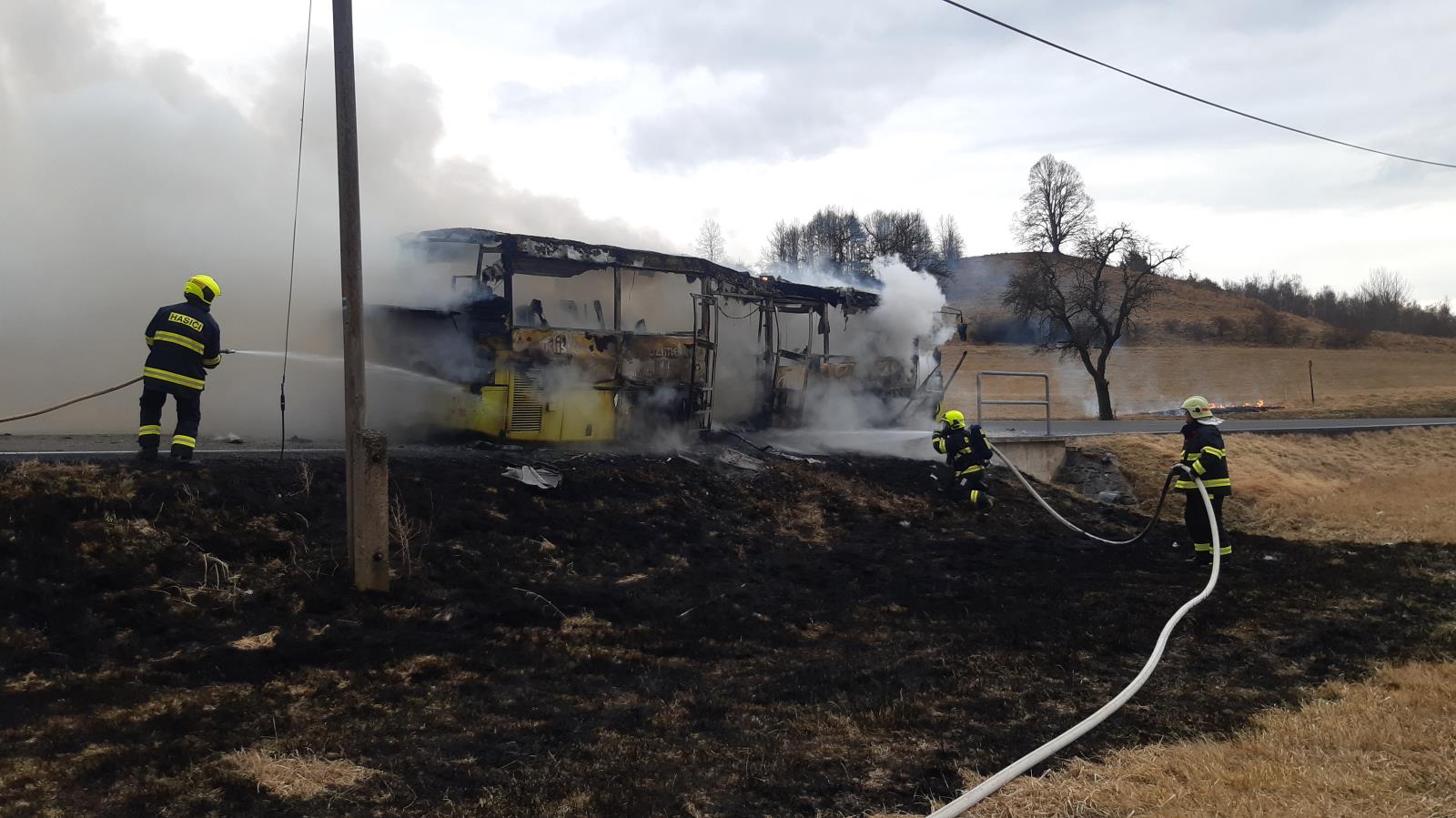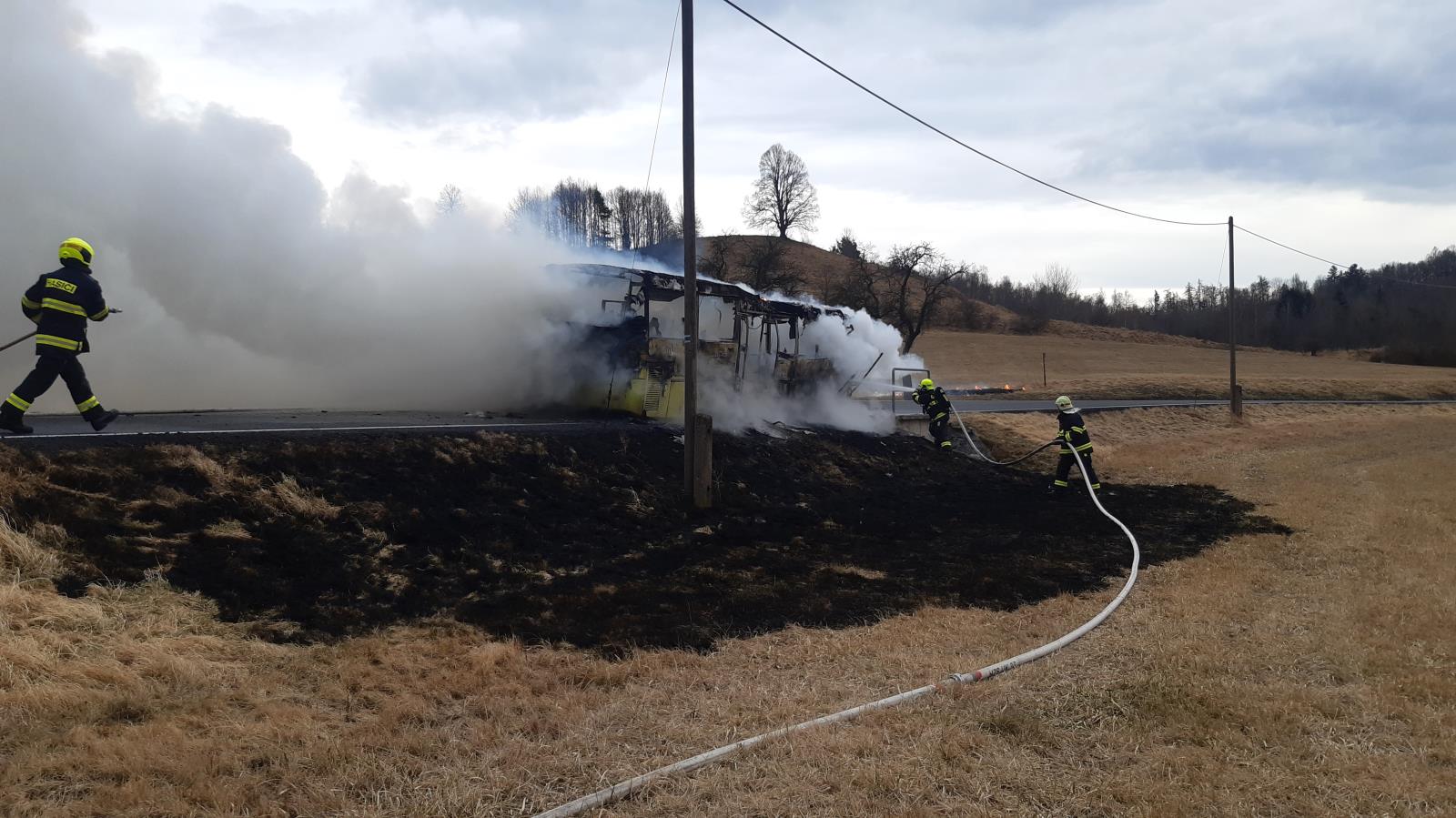 24. 2. 2022 v 16:24 hodin. Hasiči ze stanice Podbořany a dobrovolní hasiči obce Nepomyšl likvidovali požár autobusu u obce Nepomyšl na Podbořansku. V době vzniku požáru byl ve voze pouze řidič. Po příjezdu hasičů hořel autobus v plném rozsahu a dále ještě přilehlé louky po obou stranách komunikace o rozloze přibližně 50 m2. Hasiči likvidovali požár pomocí dvou vodních proudů „C“. Požár byl lokalizován v 16:59 hodin a v 17:06 byl likvidován, místo zásahu osvětleno a zahájen úklid komunikace. Při zásahu nedošlo ke zranění. Příčina vzniku požáru je v šetření.
