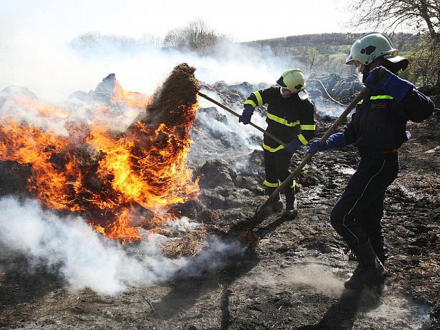Požár balíků slámy na korbě kamionu v Podbořanech