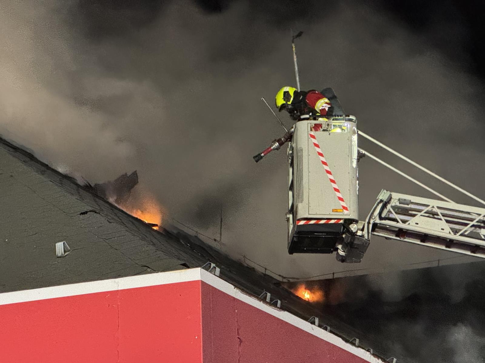 Při příjezdu byla většina střešní konstrukce již zasažena ohněm. Velitel zásahu rozhodl o nasazení tří útočných proudů – dva byly vedeny do vnitřních prostor objektu, třetí z výškové techniky zvenčí. Po přibližně hodině se podařilo požár lokalizovat.