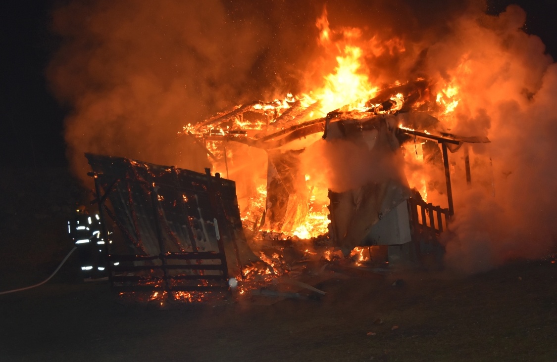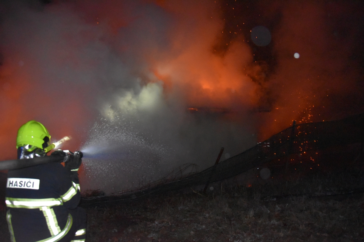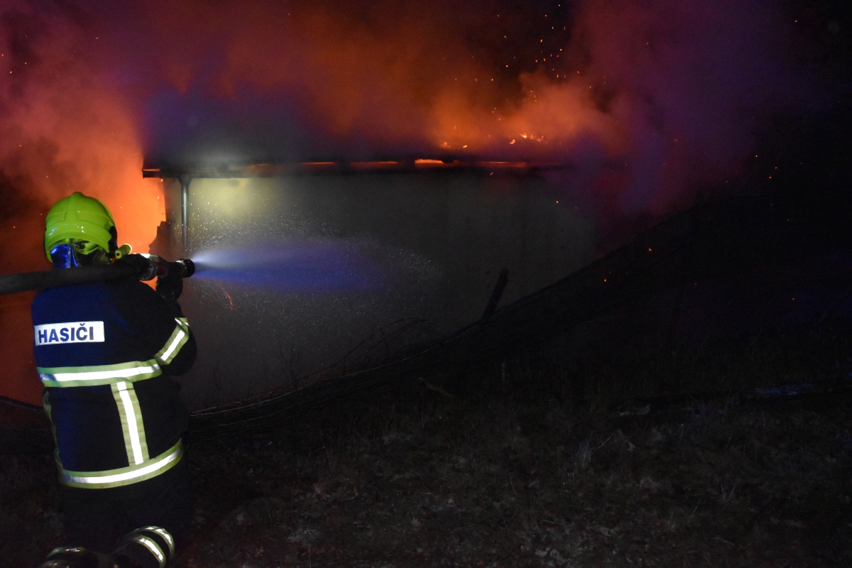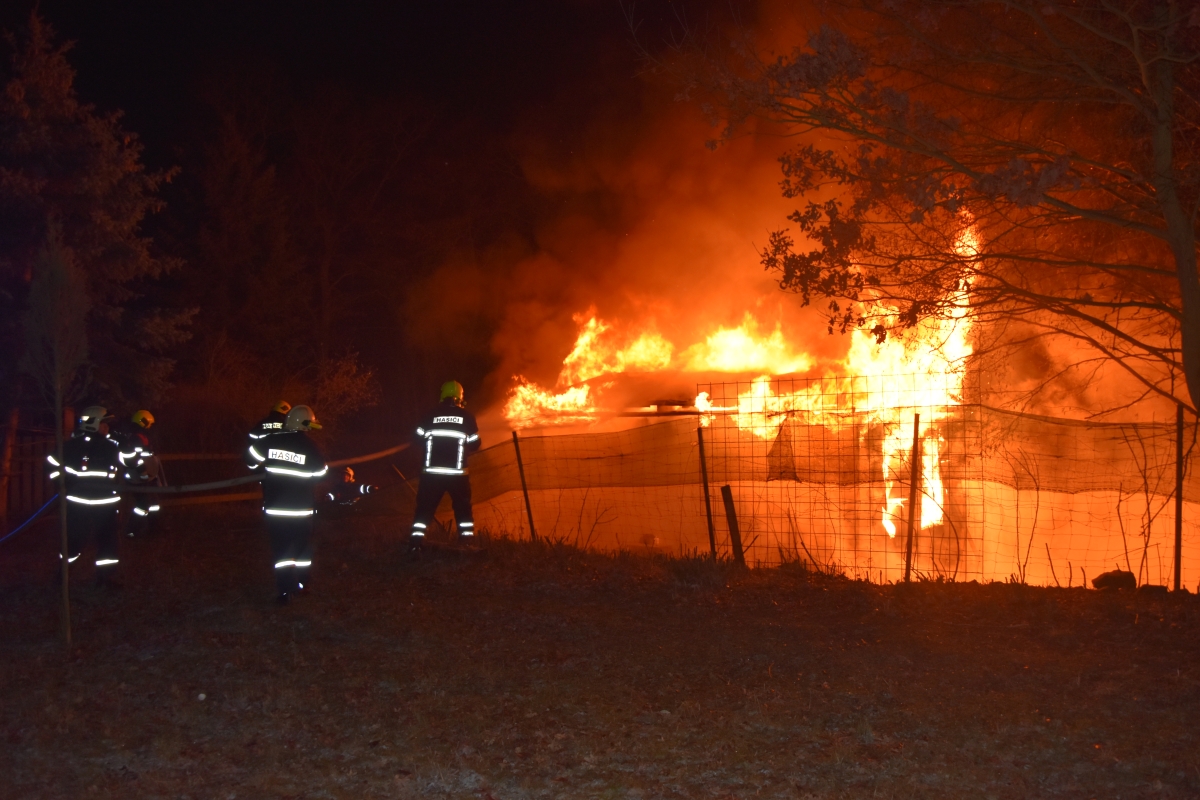 Hořela dřevěná chatka. Požár ji zasáhl celou. Hasiči uvnitř nalezli a ochladili propanbutanovou lahev.