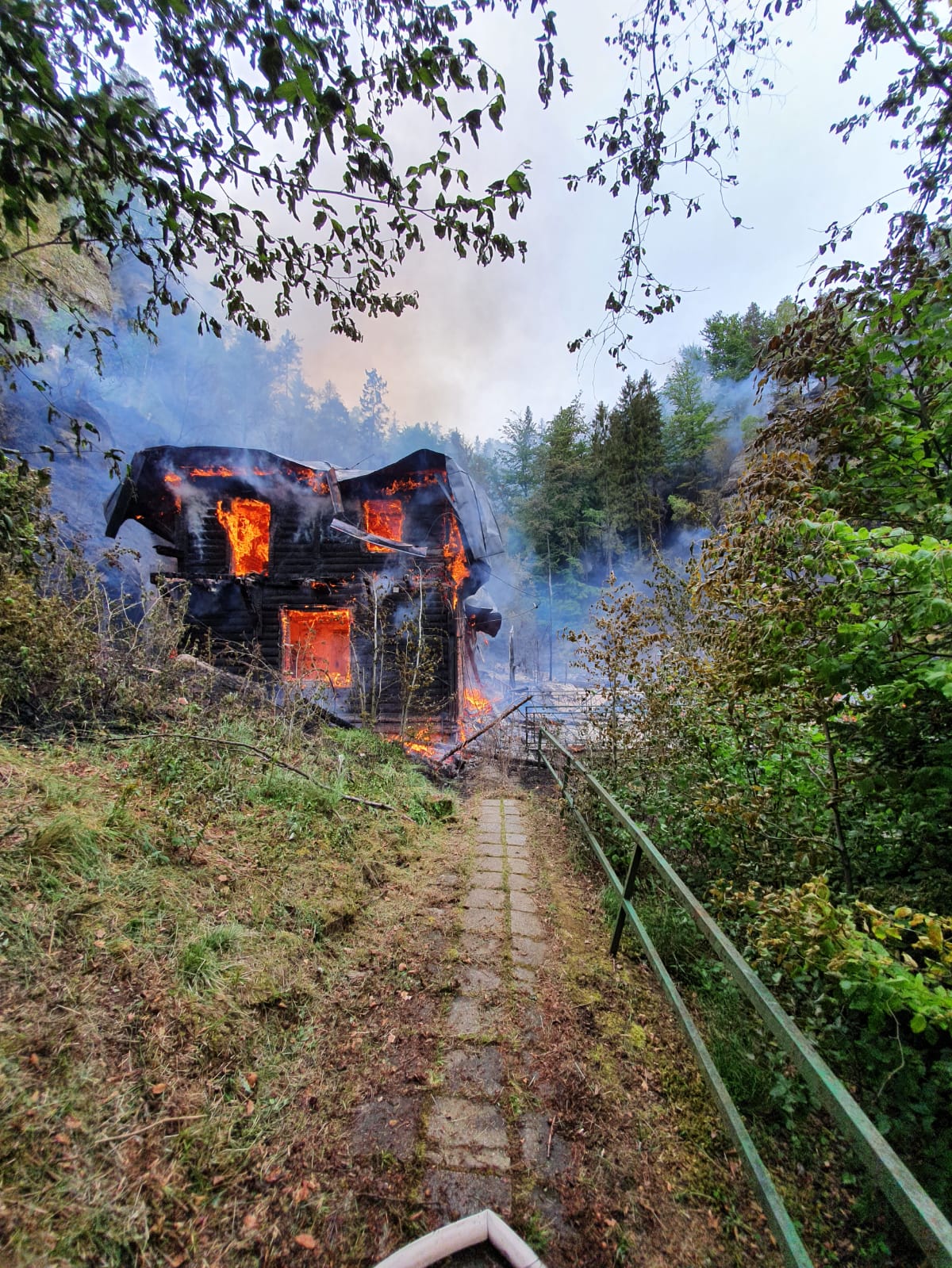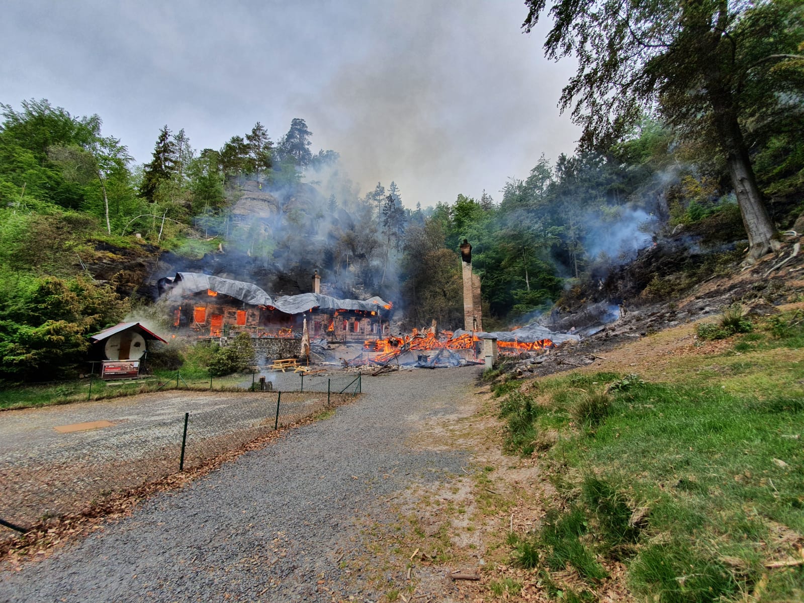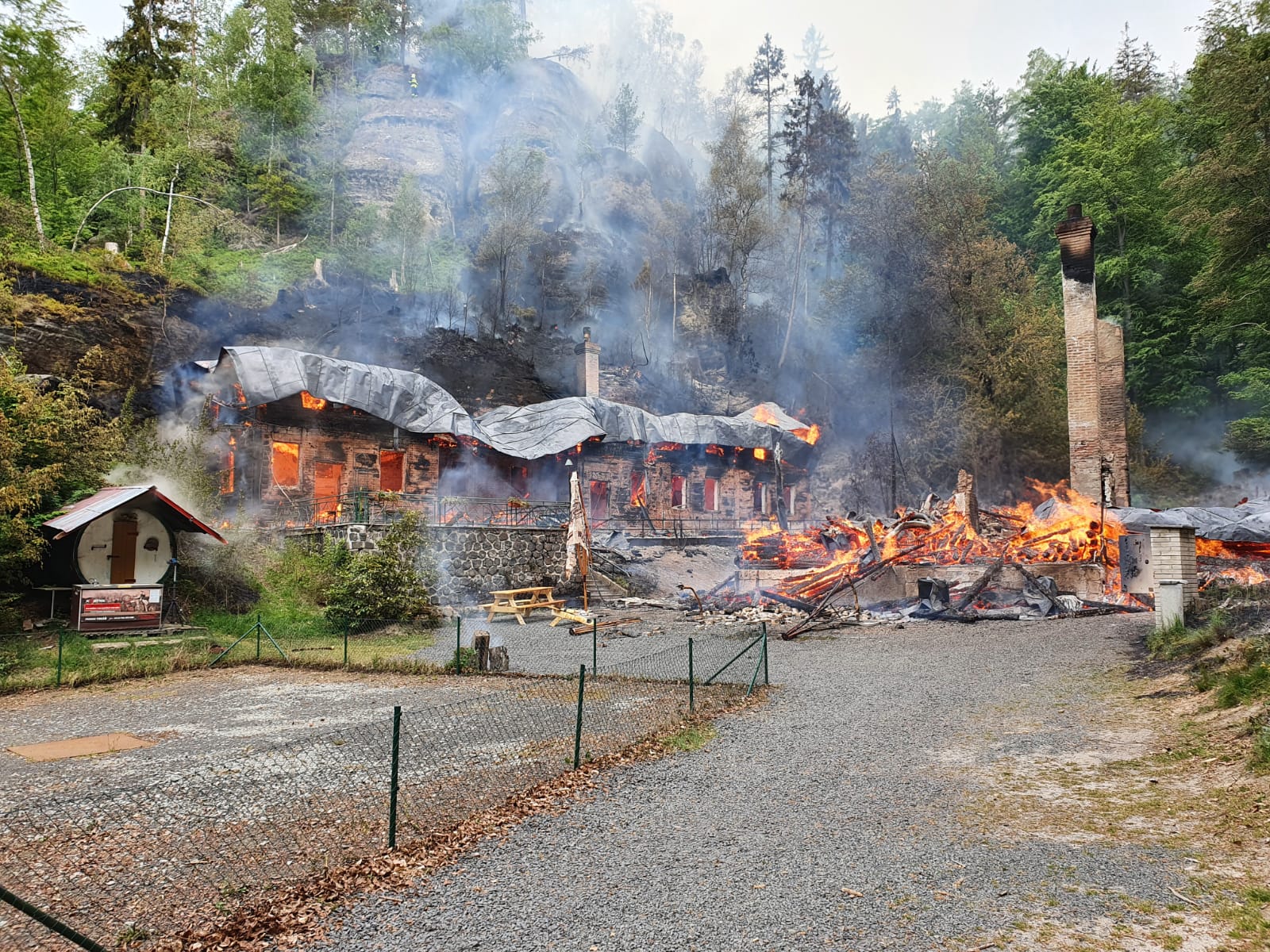 Požár penzionu s restaurací Na Tokání, přilehlé ubytovny a lesního porostu na ploše zhruba 1,5 až 2ha u Rynartic, okres Děčín byl lokalizován v 13:46. Probíhají dohašovací práce.