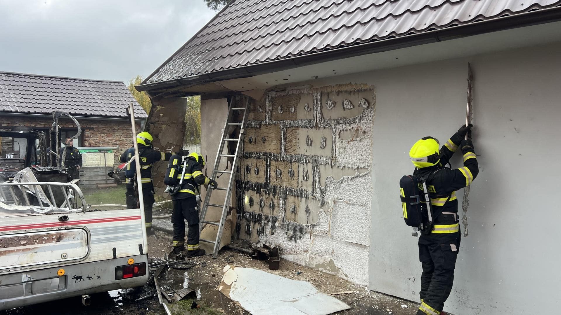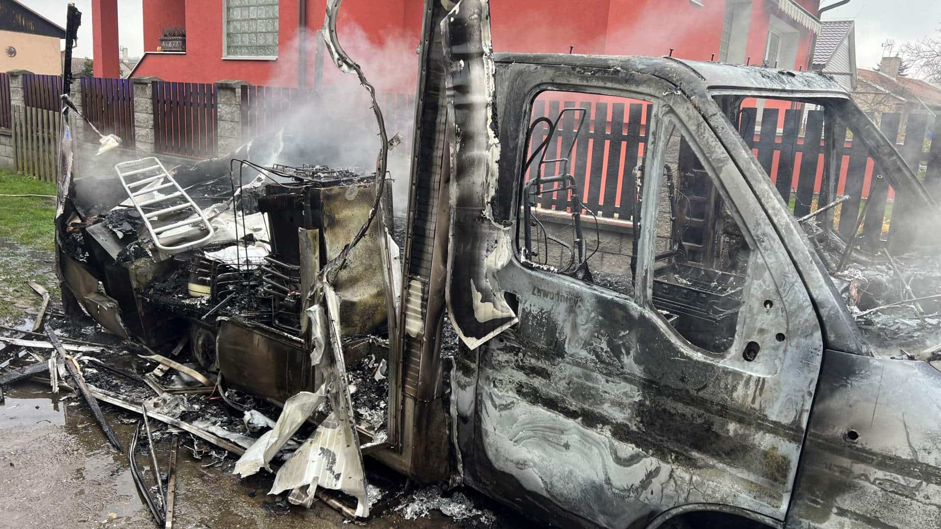 Požár obytné dodávky zachvátil celé vozidlo a ohrozil budovu