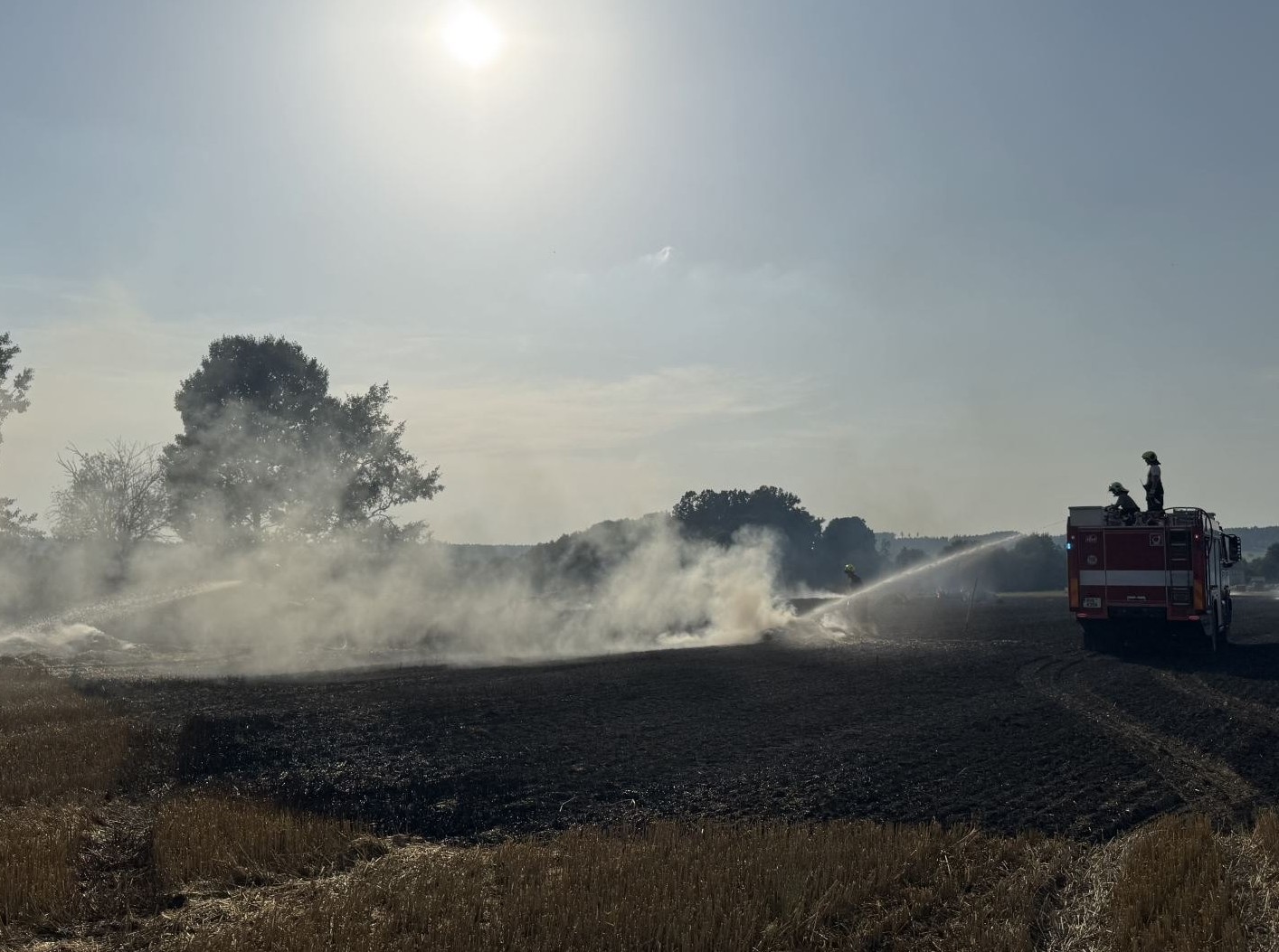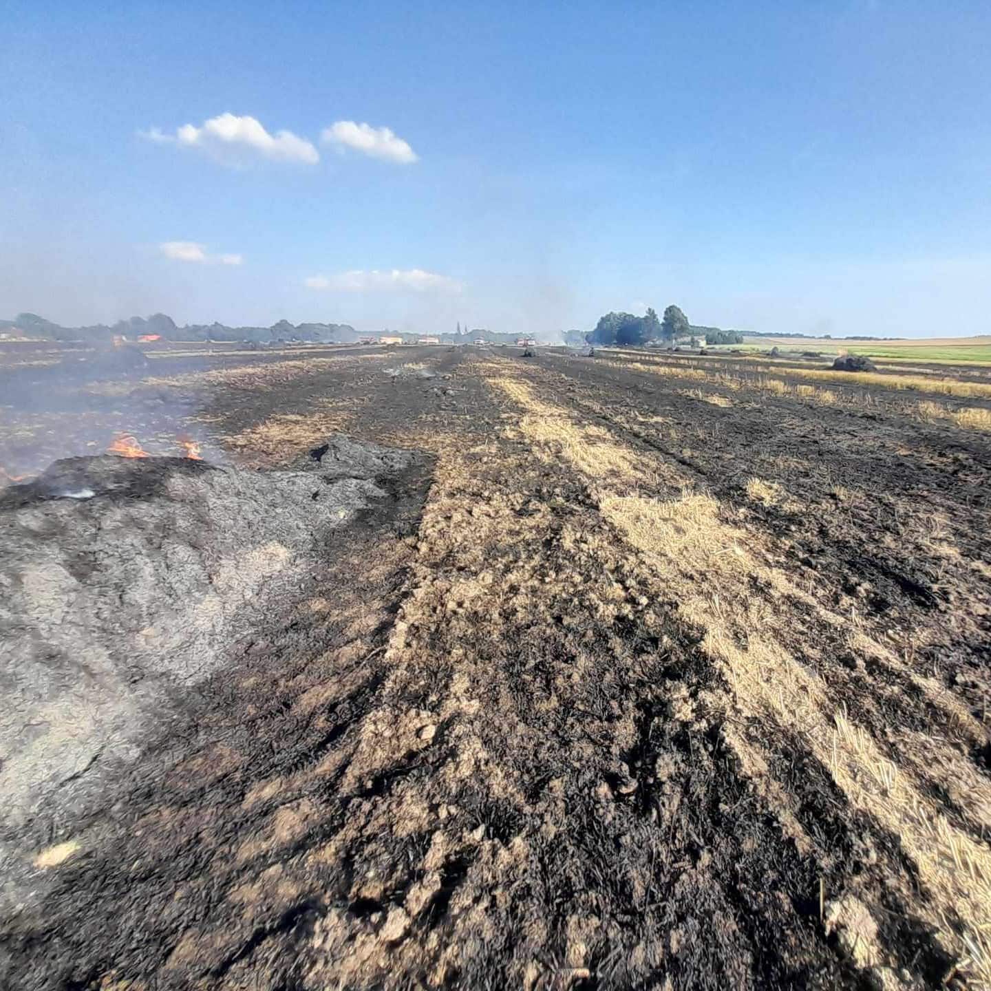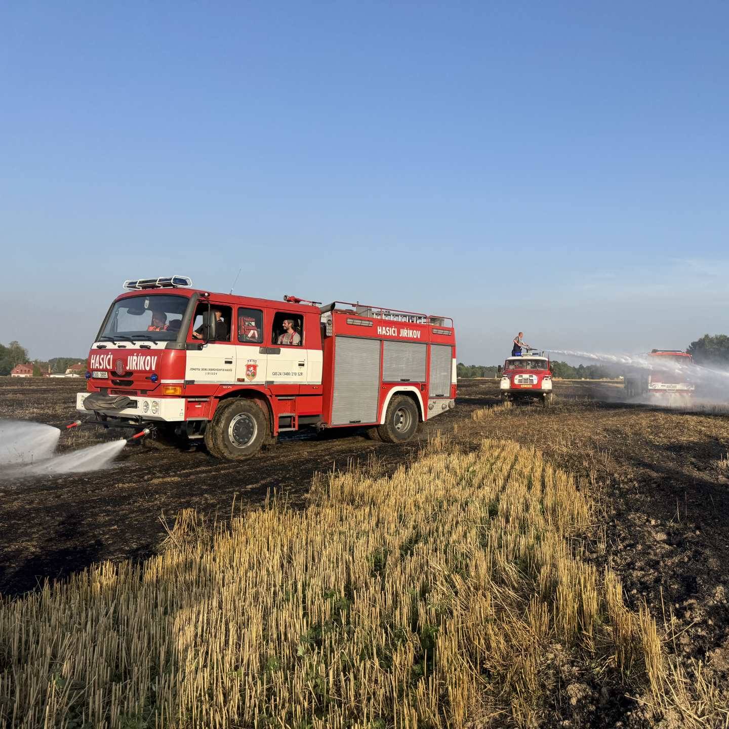 Plameny ve Starém Jiříkově zachvátily stovky metrů strniště i balíky slámy. Hasiči museli vyhlásit druhý stupeň poplachu.