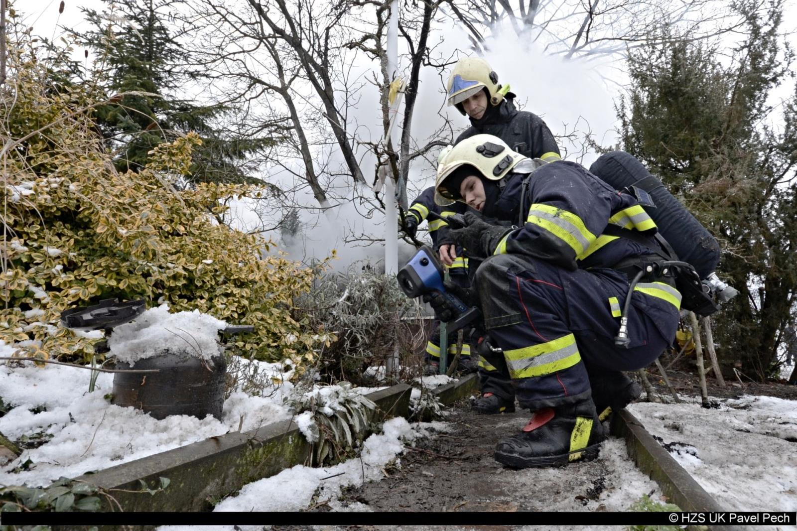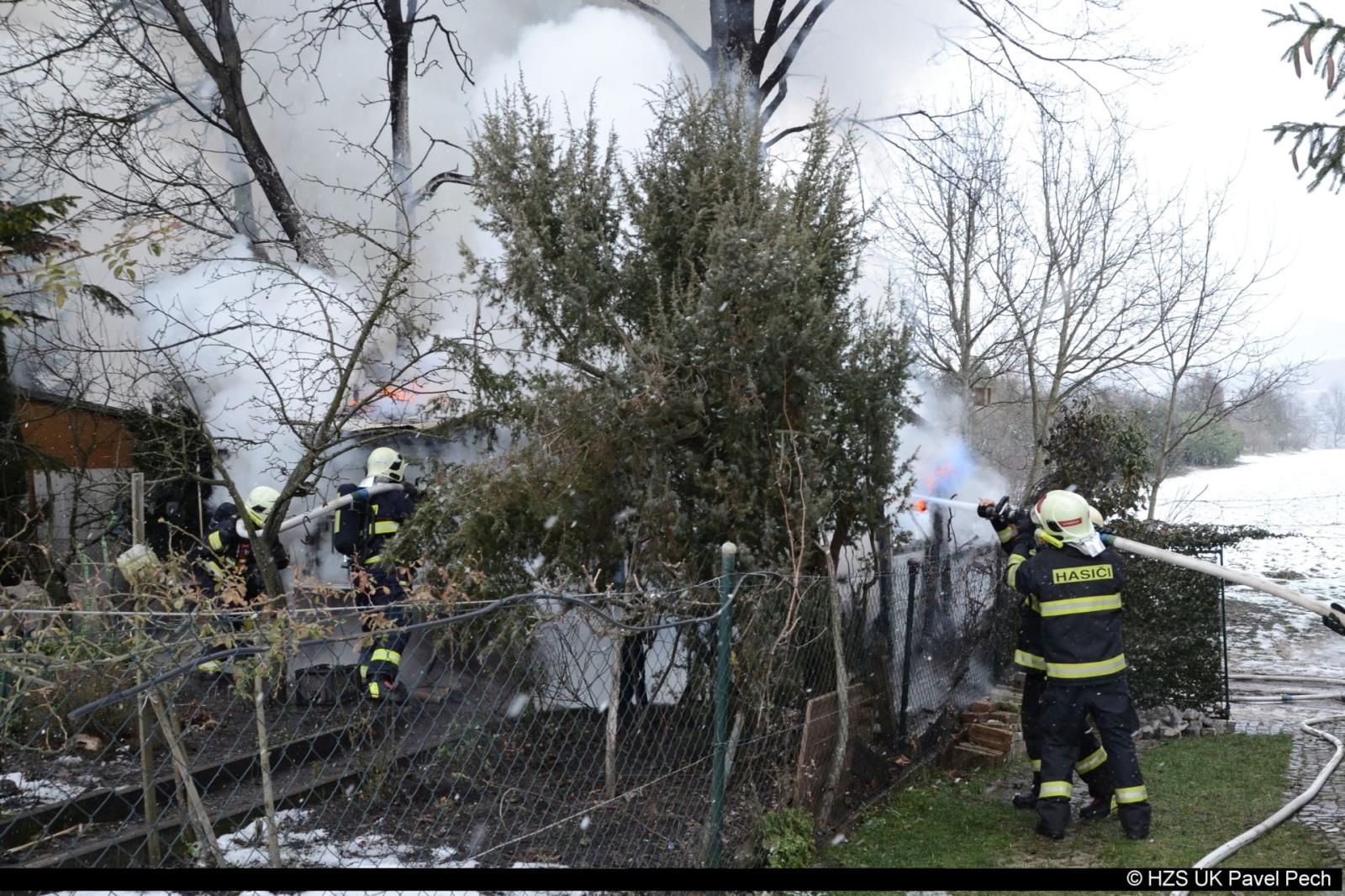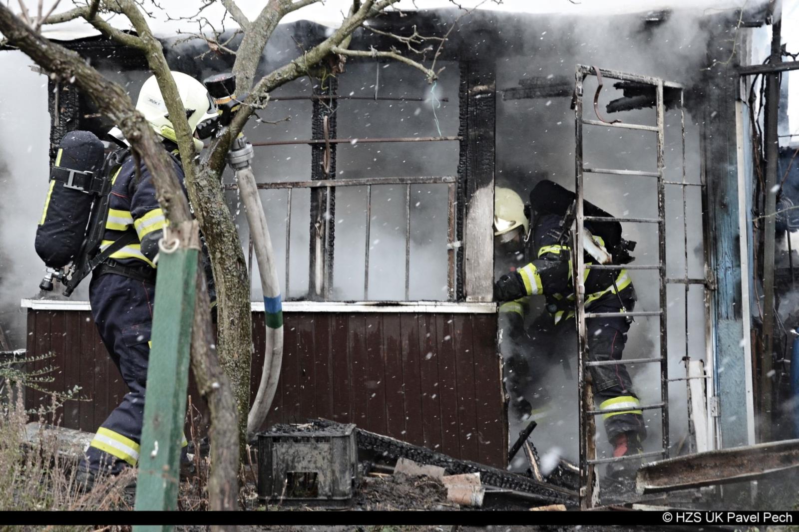 22. 1. 2018 ve  13:18 hodin vyjela jednotka HZS ÚK ze stanice Litoměřice a dobrovolná jednotka z Litoměřic  k požáru v Litoměřicích – Předměstí, U Richarda. Hořela zahradní chatka. Požár ji zasáhl celou. Hasiči vynesli a ochladili propanbutanovou lahev. Požár lokalizovali v 13:42 a zlikvidovali v 15:43. Požářiště proměřili termo kamerou. Foto: HZS ÚK Pavel Pech