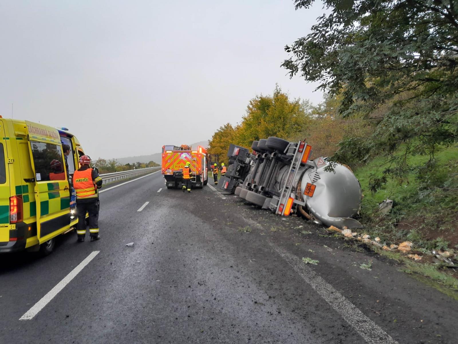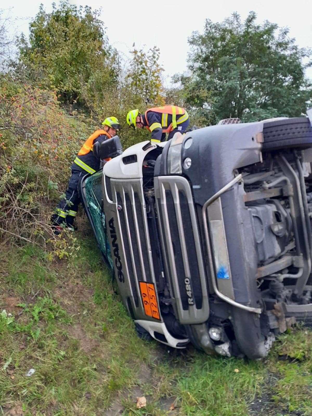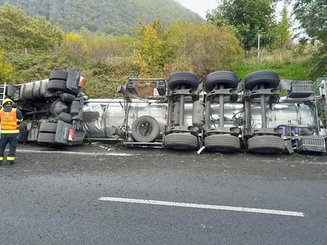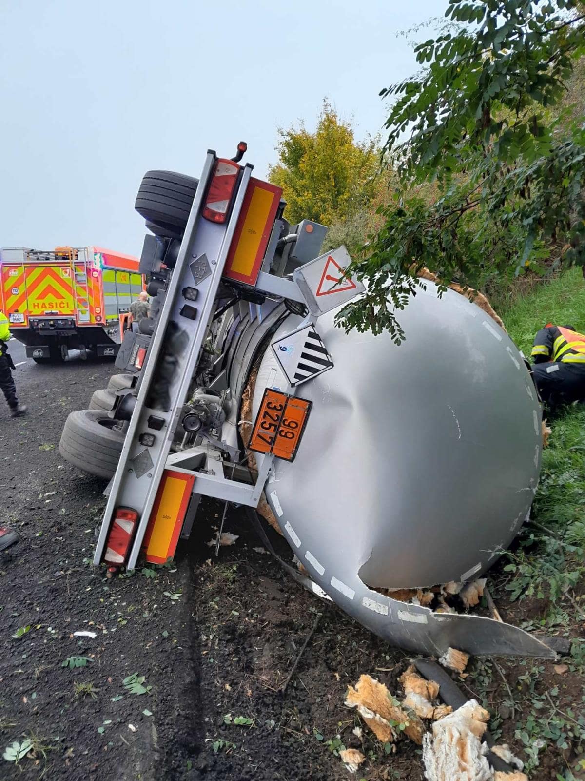Převrácená cisterna zablokovala silnici: hasiči zasahovali celé odpoledne