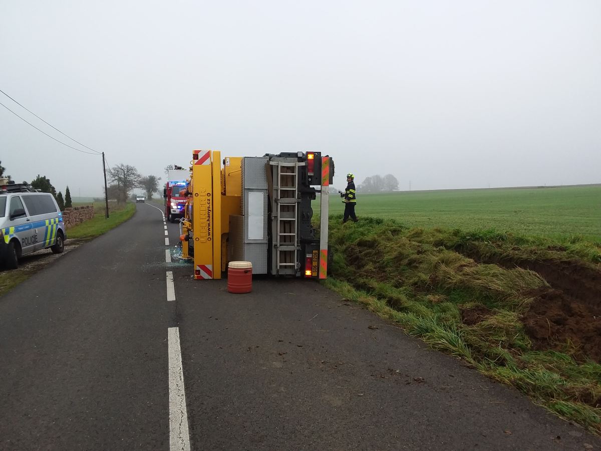 15. 11. 2022 12:43 Jednotka ze stanice Teplice vyjela k převrácenému autojeřábu na silnici u Modlan. Jeřáb sjel z krajnice a převrátil se na bok. Nikdo nebyl zraněn. Hasiči likvidují unikající pohonné hmoty a snaží se zastavit jejich únik.