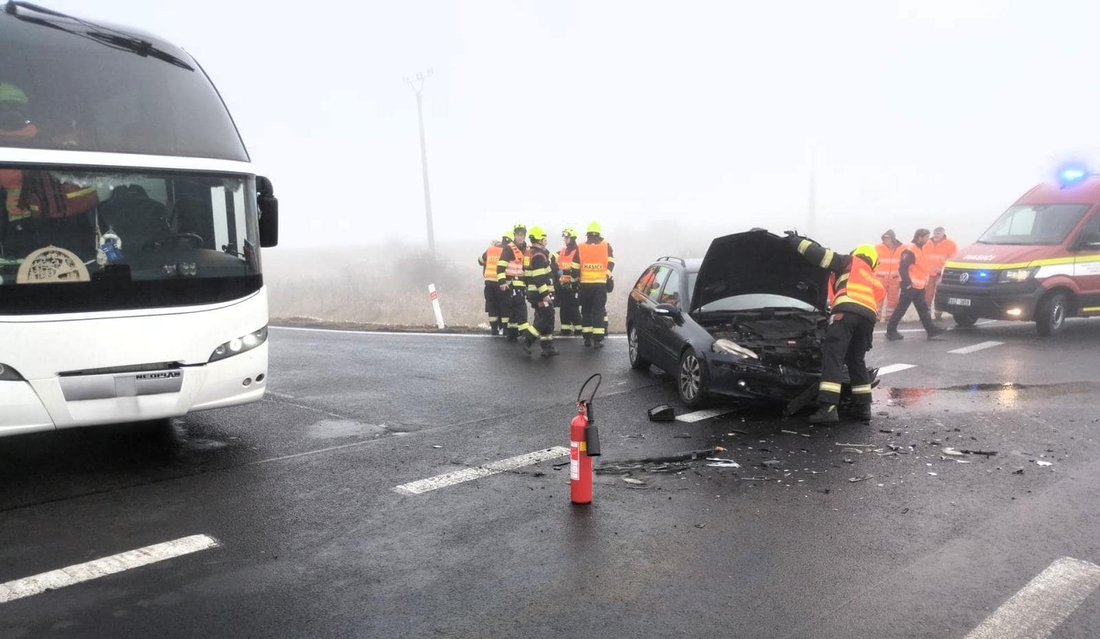 Dopravní nehoda autobusu a osobního automobilu zastavila na několik hodin provoz na důležité mezinárodní silnici. Díky rychlému zásahu složek IZS se podařilo situaci zvládnout bez zranění cestujících z autobusu.