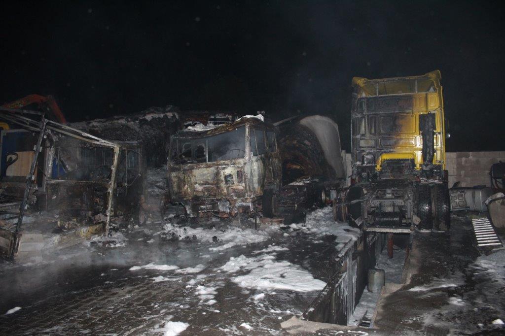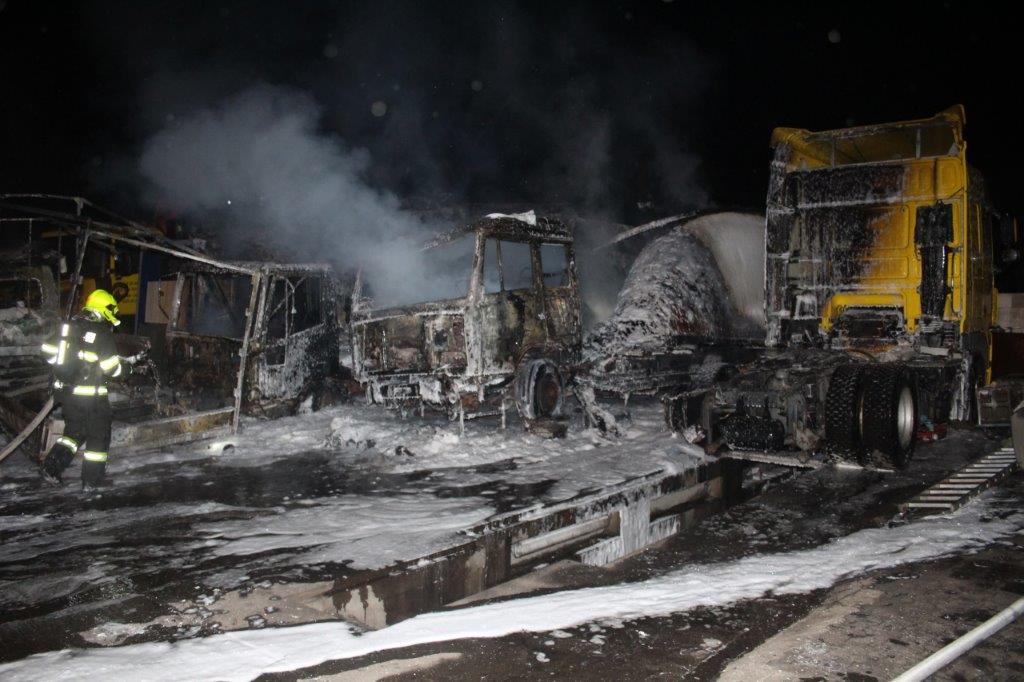 Technická závada způsobila požár tří nákladních aut v areálu firmy