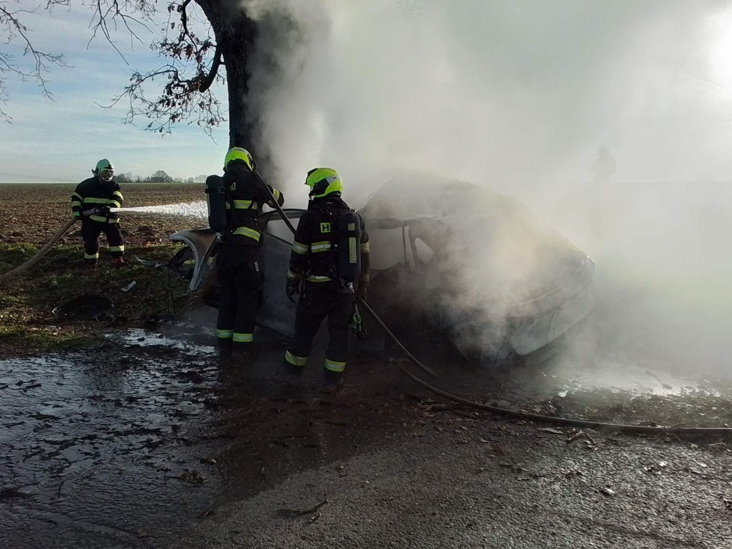 V pondělí dopoledne zasahovaly tři jednotky hasičů u vážné nehody na komunikaci číslo 2691 poblíž obce Střížovice na Litoměřicku. Osobní automobil tam narazil do stromu a krátce poté začal hořet. Oheň se rychle šířil a zcela zachvátil přední část vozu. Krajské operační středisko vyslalo jednotky na základě signálu z automatického nouzového volání, které zaznamenalo náraz.