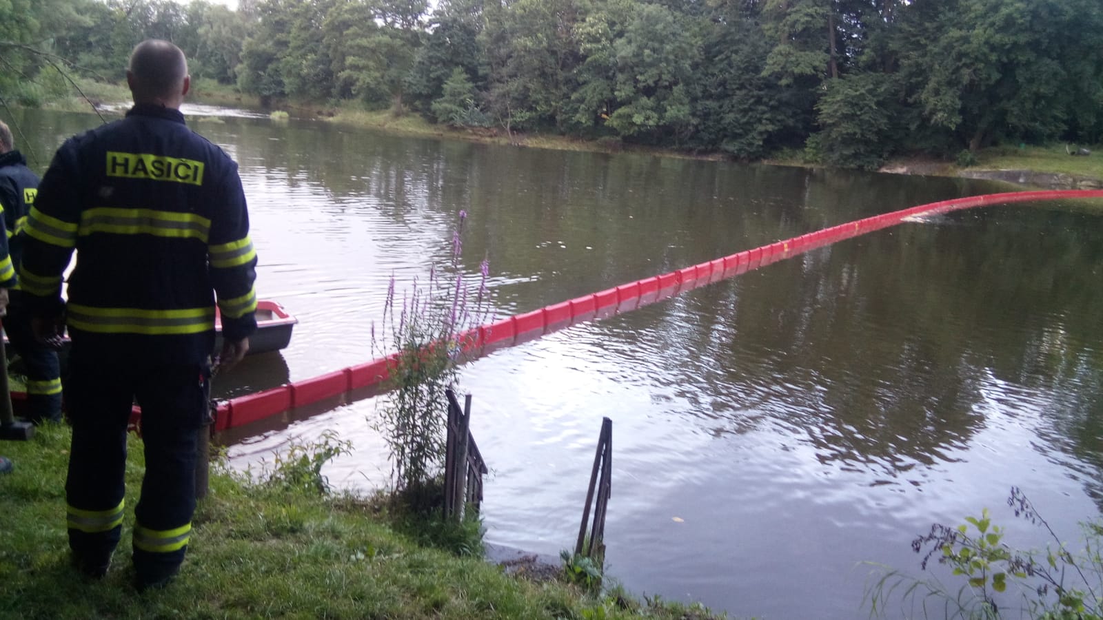 Hasiči zachycují ropné látky pomocí norných stěn, které v proudu řeky drží motorový člun.