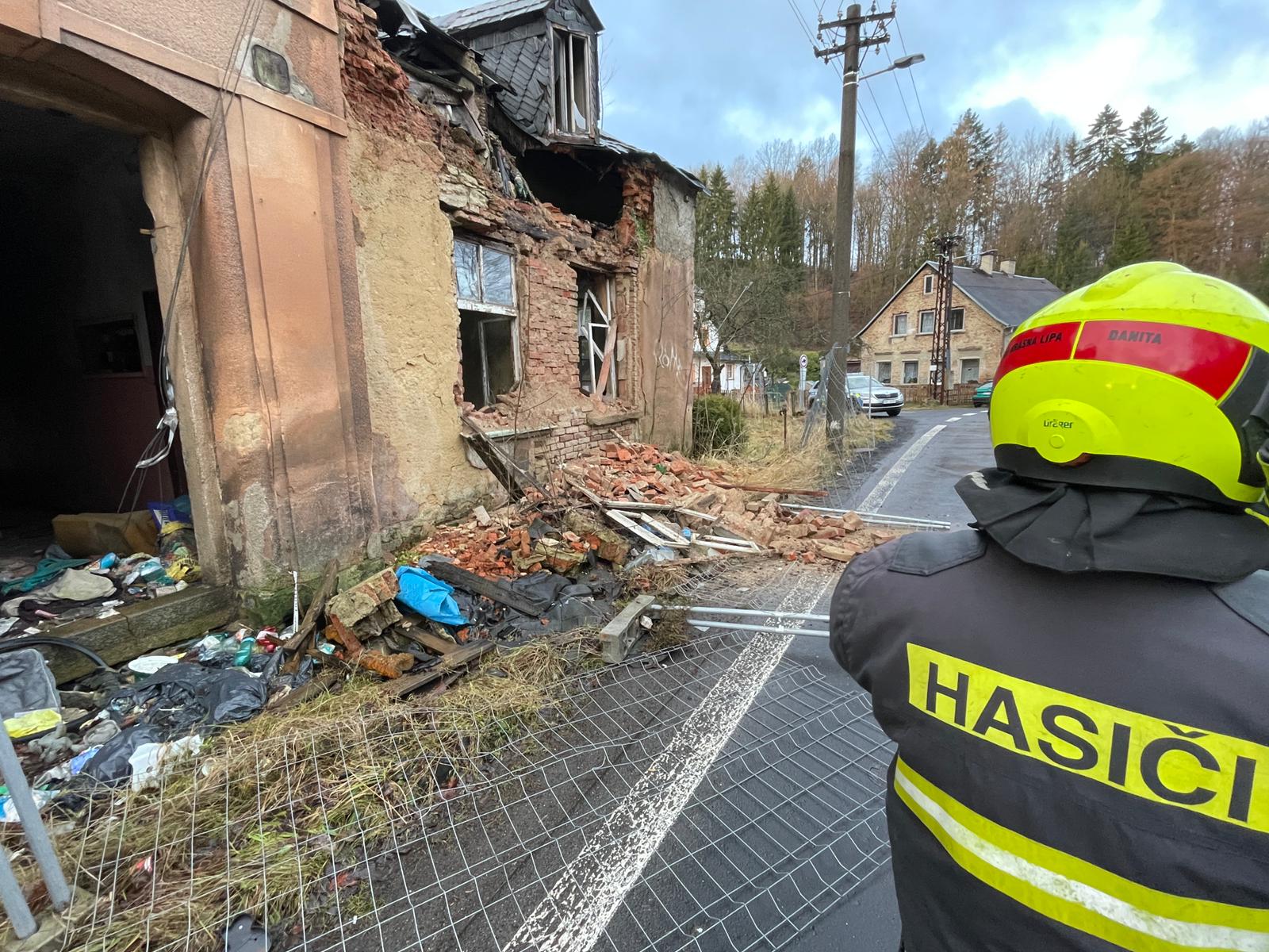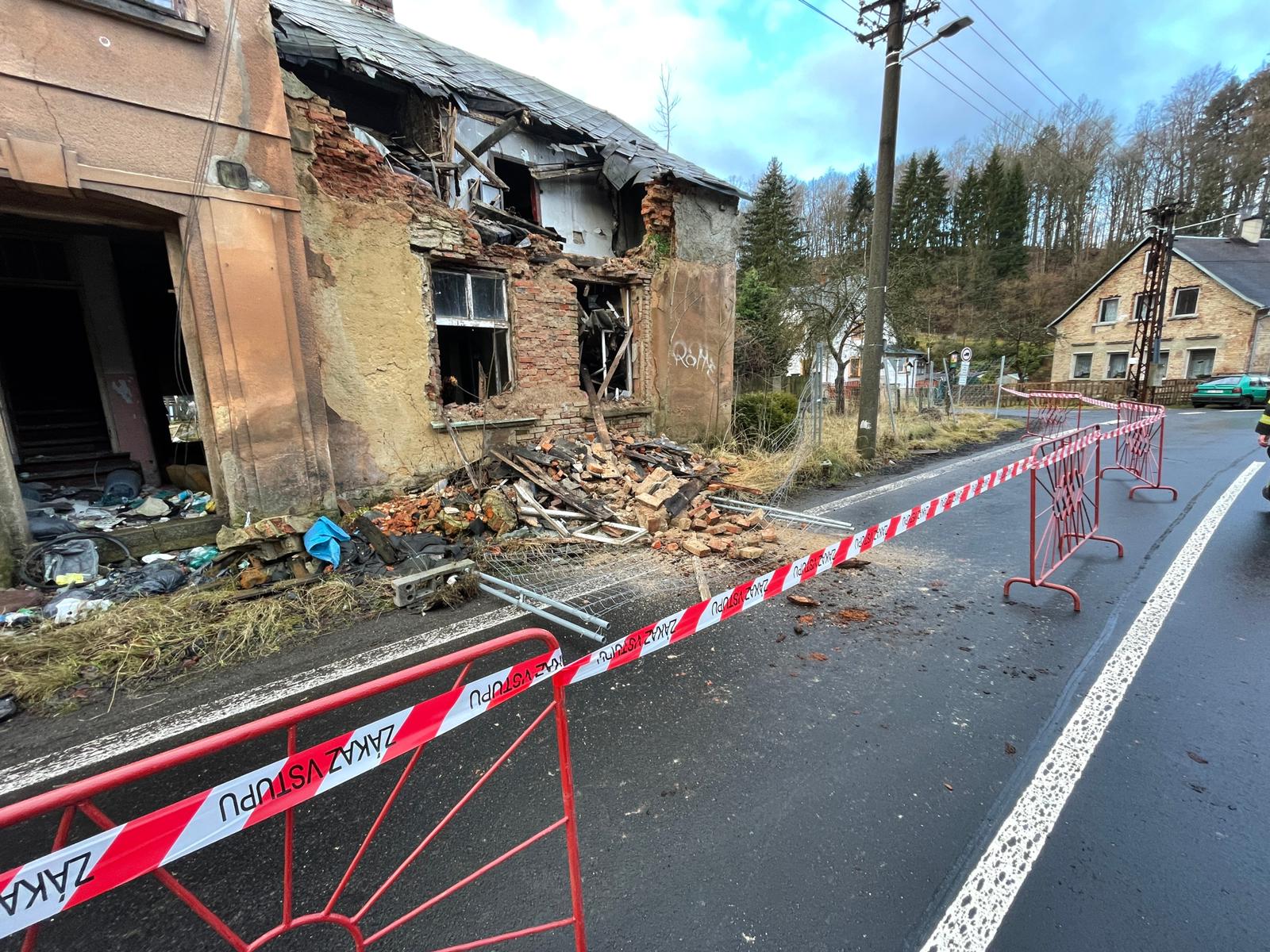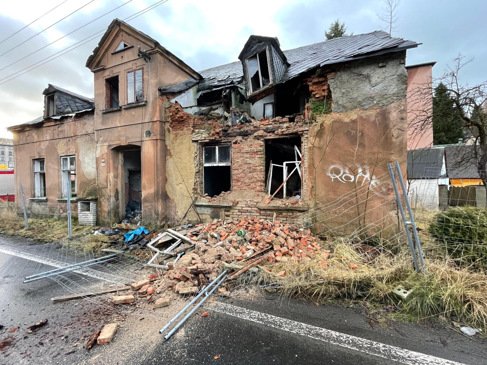 V Krásné Lípě spadla na vozovku část domu