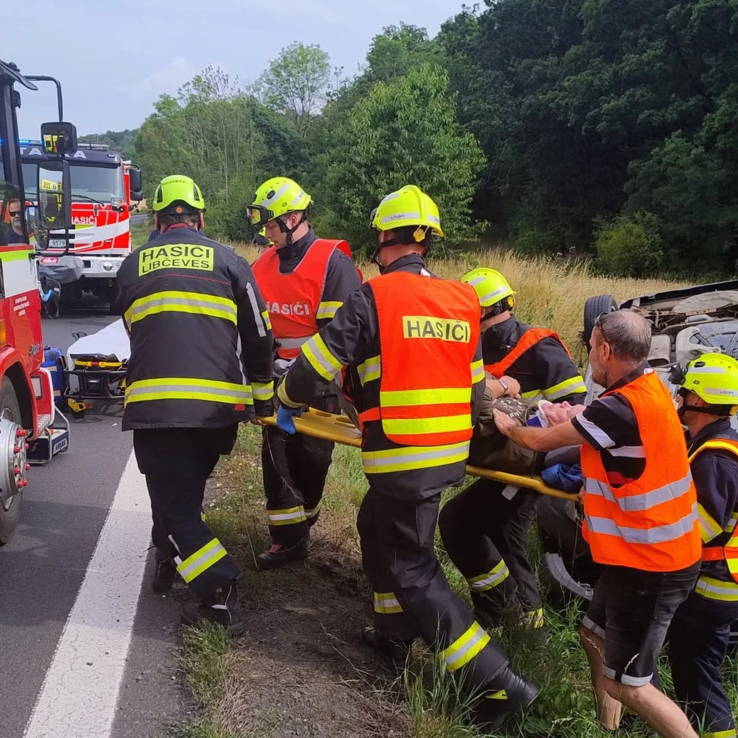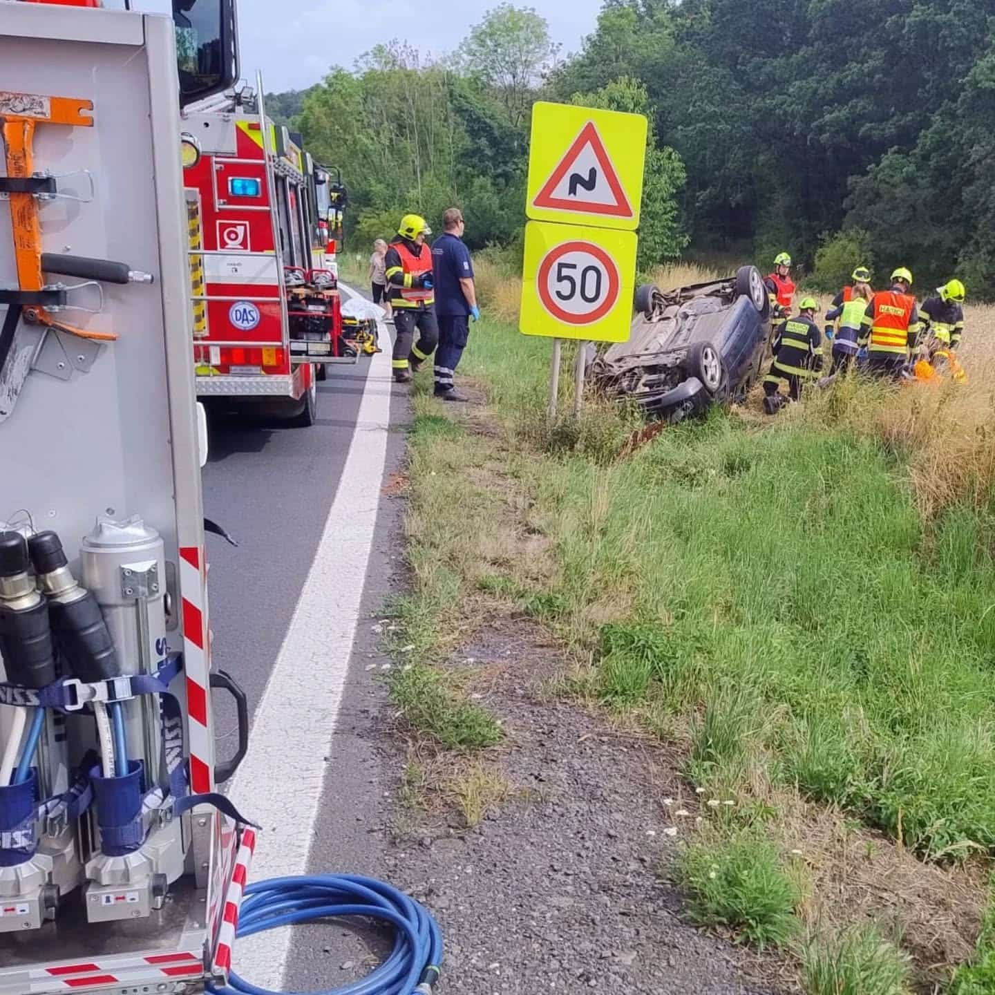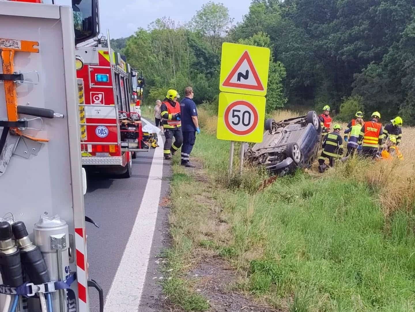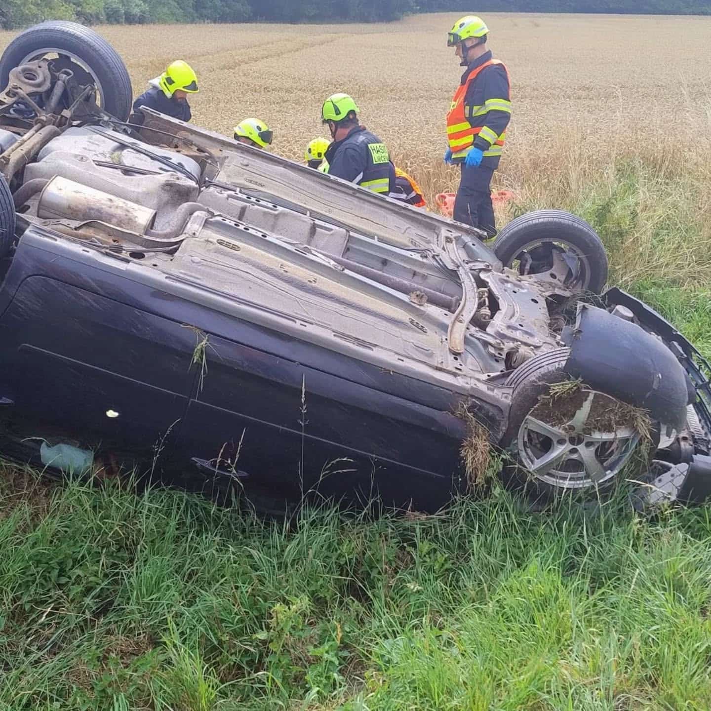 Dramatická nehoda u Kozly zaměstnala všechny složky IZS. Osobní vůz skončil převrácený na střeše, uvnitř zůstal zraněný člověk. Hasiči zasahovali s pomocí páteřní desky.
