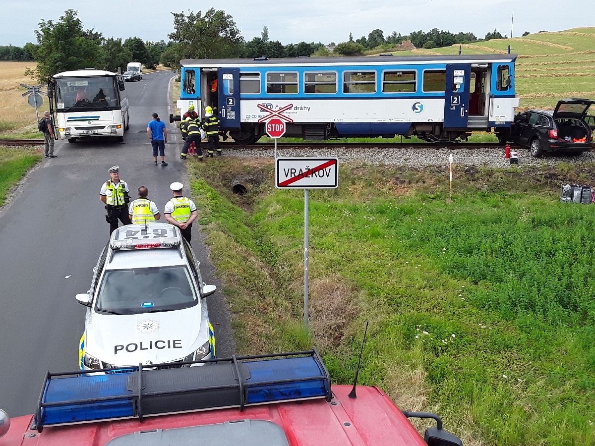 20. 8. 2021 v 8:45 hodin. Hasiči ze stanice Roudnice nad Labem a drážní hasiči z Ústí nad Labem a Kralup nad Vltavou zasahují u dopravní nehody motorového vlaku a osobního automobilu na železničím přejezdu č. P2553 u obce Vražkov na Roudnicku. Jednalo se o lehký střet vozidel. Hasiči provedli protipožární opatření na vozidlech a kontrolu úniku provozních kapalin. V automobilu cestovali čtyři a ve vlaku osm osob. Jedna zraněná osoba z automobilu byla předána do péče Zdravotnické záchranné služby. Dopravce zajistil pro cestující náhradní autobusovou dopravu.