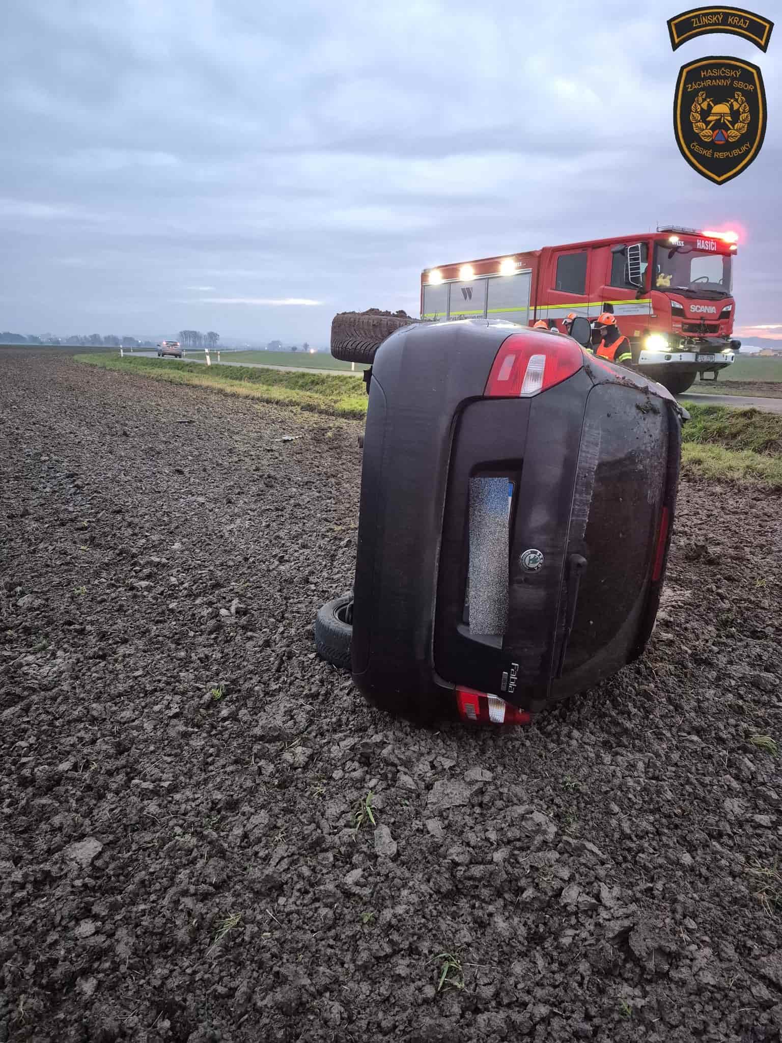 Ranní nehoda u Ludslavic se obešla bez zranění. Osobní vůz sjel ze silnice a převrátil se na bok do pole. Řidič se dokázal dostat ven ještě před příjezdem jednotky profesionálních hasičů z Holešova. Ti zajistili místo, otočili vozidlo zpět na kola a prověřili možné úniky kapalin. Odtah si zajistí majitel.