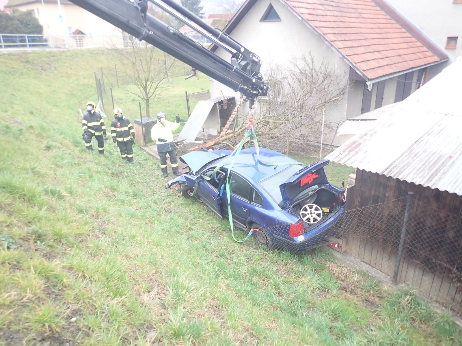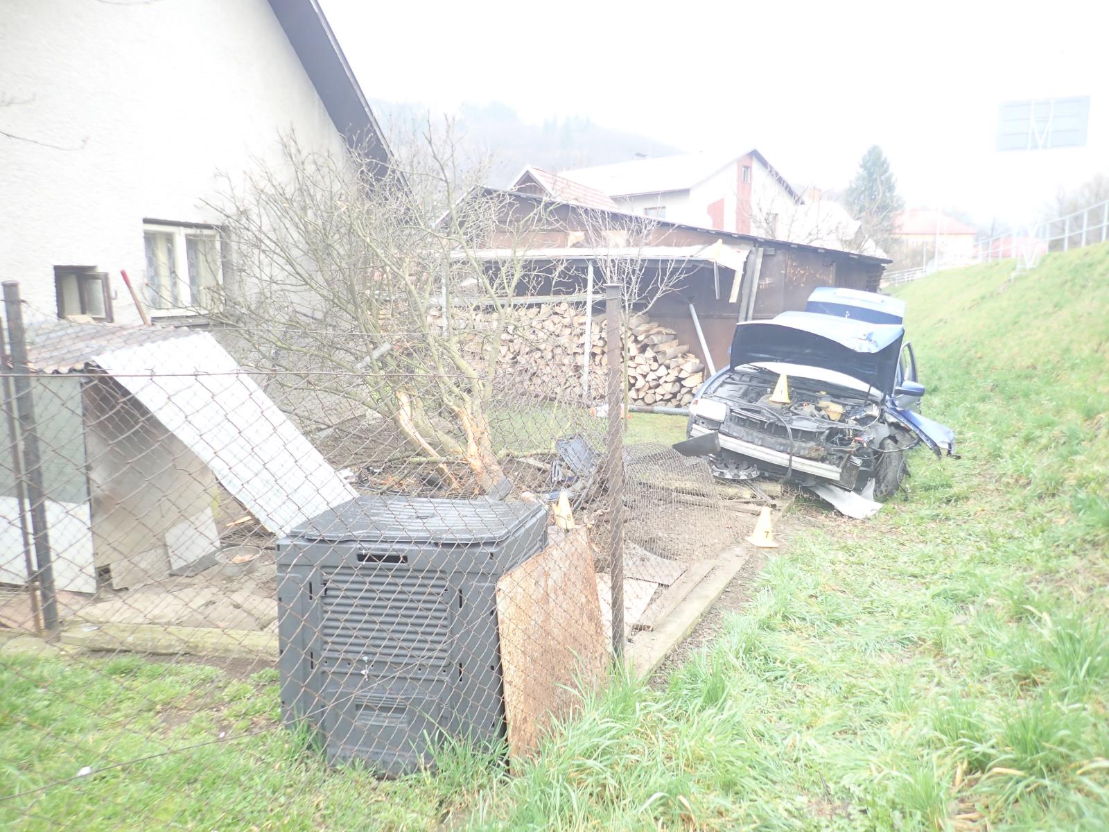 Řidič osobního vozidla, jedoucí spolu s dalšími třemi spolucestujícími, sjel na kruhovém objezdu mimo cestu přes zábradlí do zahrady rodinného domu, kde porazil plot, zlomil strom a zbořil kurník. Při nehodě byla zraněna jedna osoba, další cestující vyvázli bez zranění. Dále v autě jel pes, který taktéž utrpěl zranění. Všichni se dostali z vozidla bez cizí pomoci.