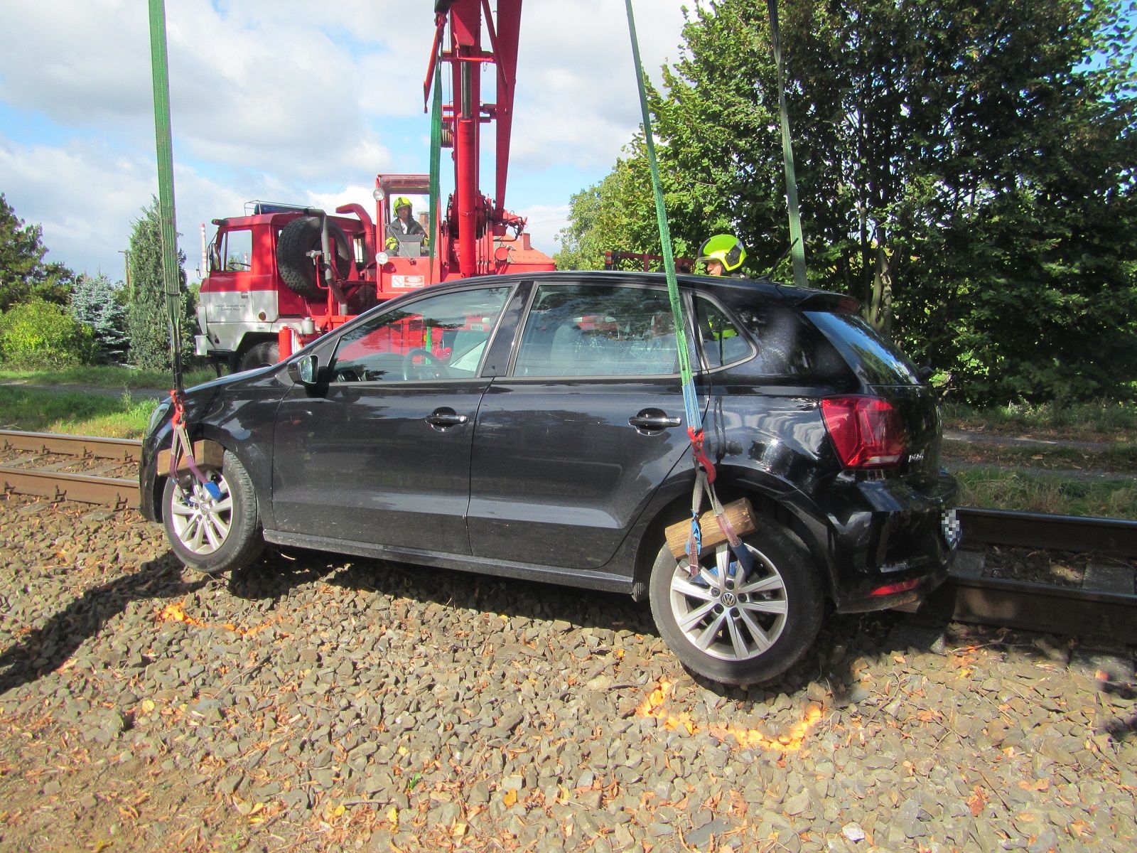 Po příjezdu na místo nehody hasiči zjistili, že jedno z osobních vozidel stojí na kolejích. Žádný z účastníků nebyl zraněn. Doprava na železniční trati byla oboustranně uzavřena. Hasiči provedli protipožární opatření a na místo byl povolán automobilový žebřík.