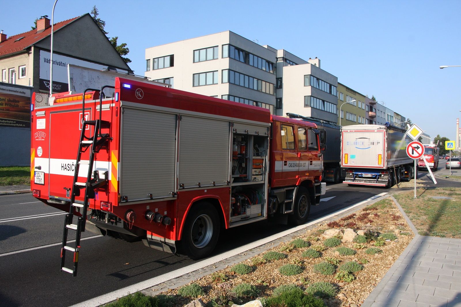Nákladní automobil, který vezl 28 tun biologického odpadu, blokoval v době příjezdu hasičů výjezd z ulice Lorencova a také jeden jízdní pruh na třídě Tomáše Bati. Asi 500 kilogramů mastného biologického odpadu leželo na silnici i nákladním vozidle. Řidič hasičům sdělil, že při náhlém brzdění převážený materiál utrhl krycí plachtu a část vypadla na silnici. Dále sdělil, že firma zajistí odvoz uniklého odpadu.