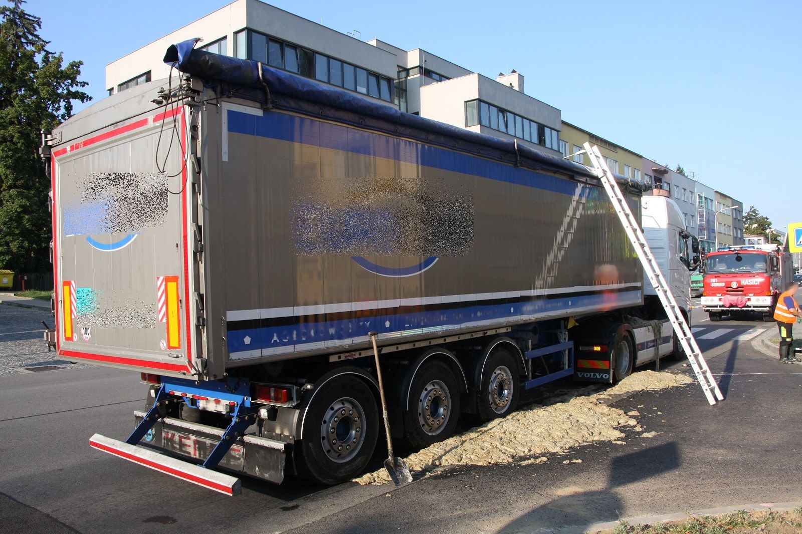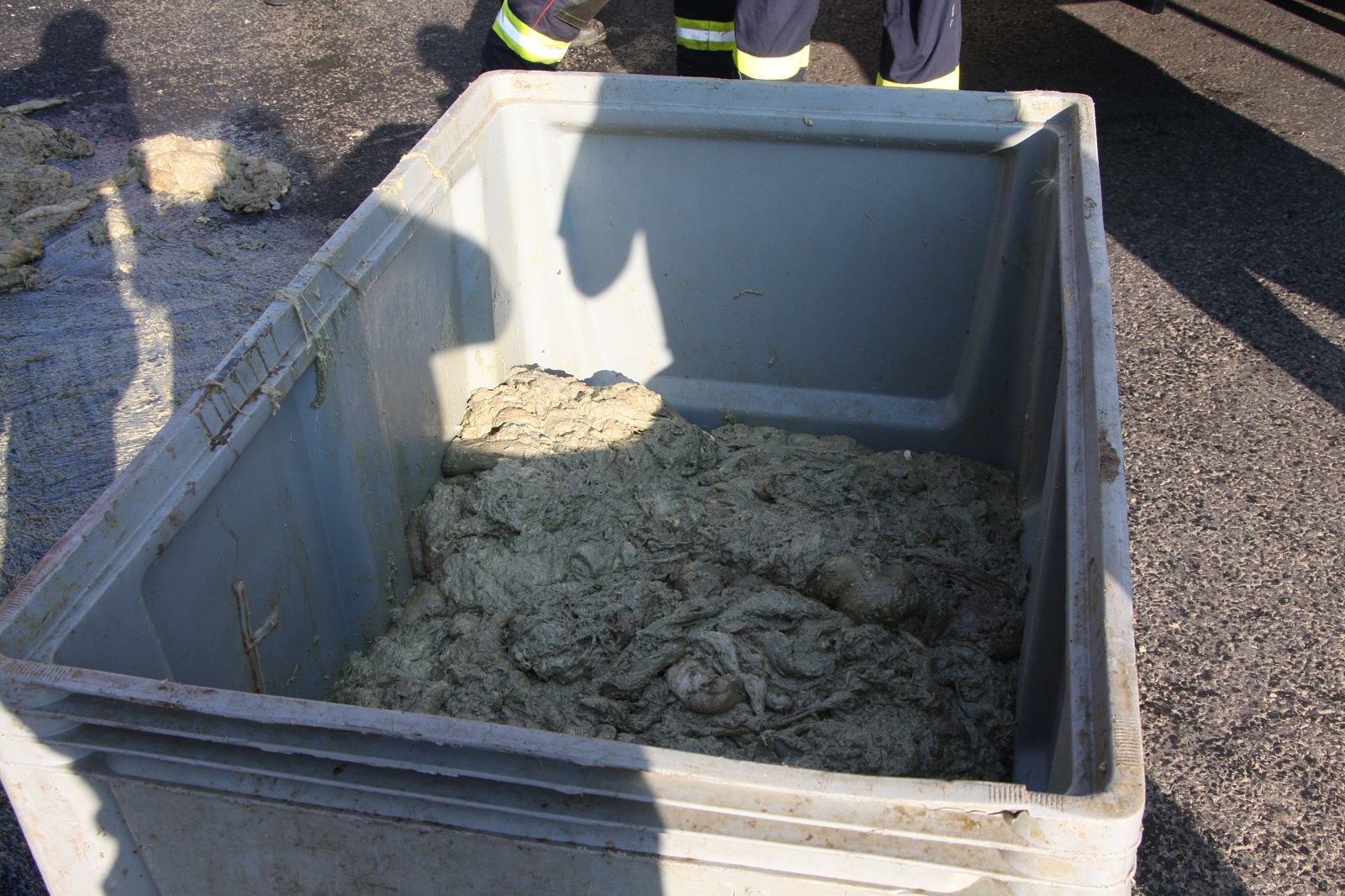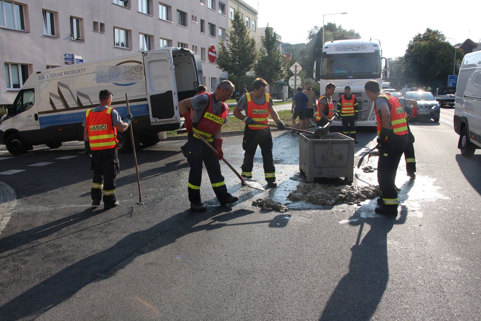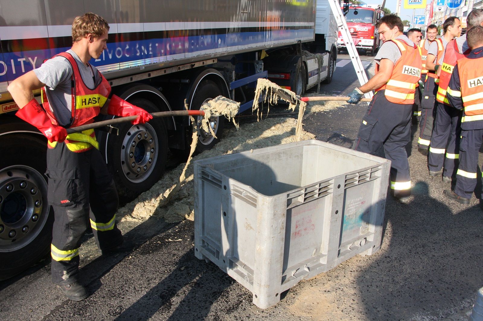 Po příjezdu dodávkového automobilu firmy hasiči lopatami naložili uniklý odpad do připravených kontejnerů. Kontejnery pak naložili zpět do dodávky. Vysokotlakým proudem vody následně provedli oplach silnice.