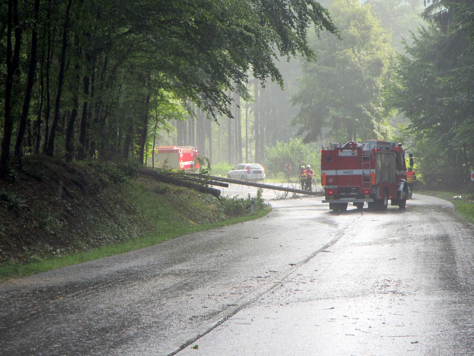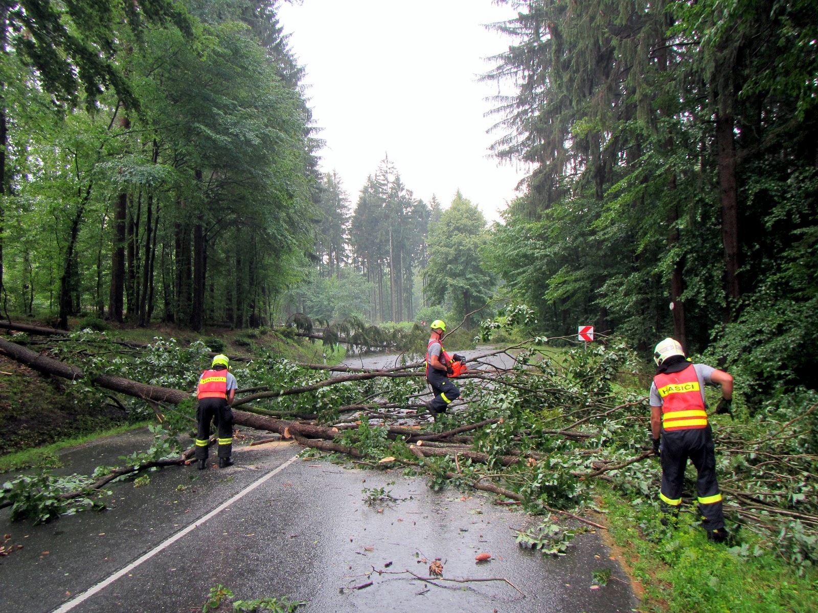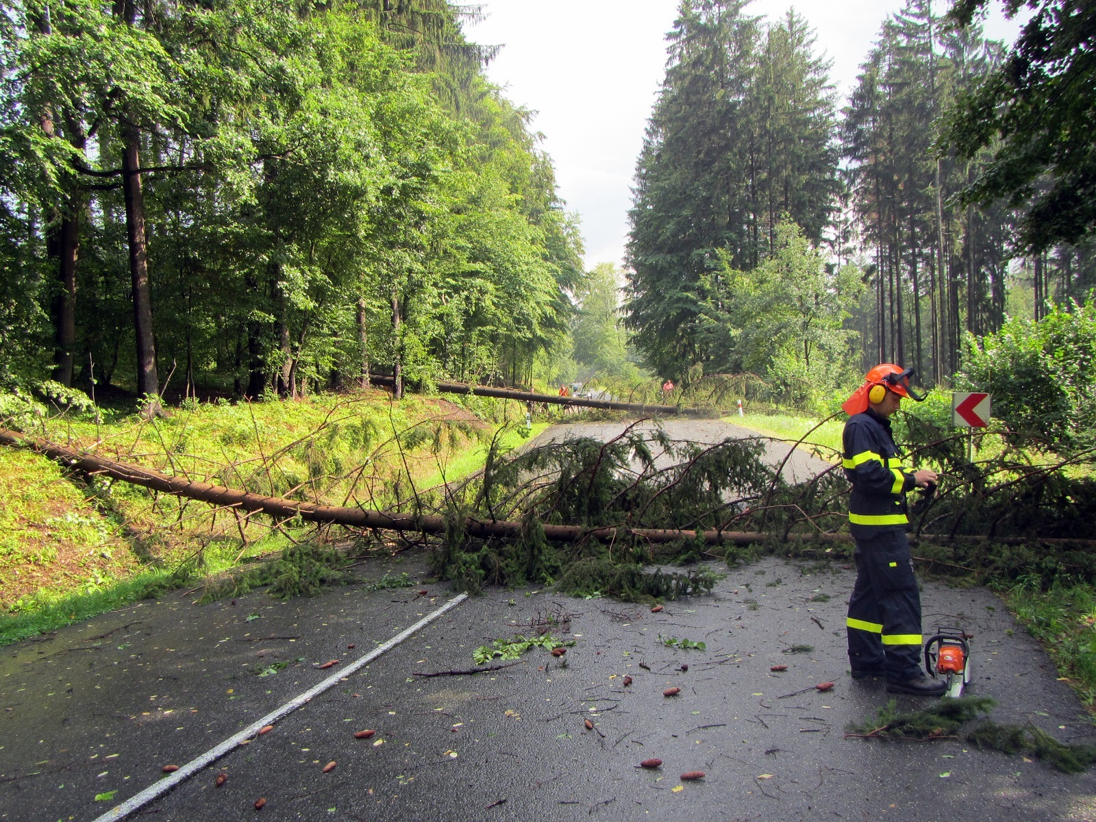 Pomocí tří motorových pil odstranili hasiči během necelé hodiny z komunikace celkem devět stromů. Další dva vzrostlé stromy hrozící pádem byli nuceni skácet.