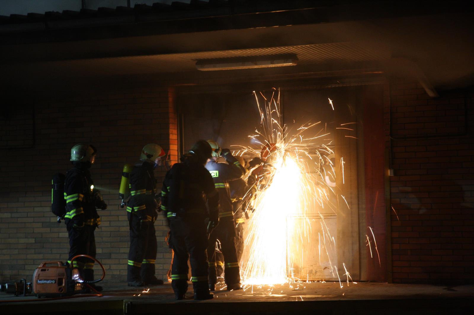 Vzhledem ke skutečnosti, že ani intenzivní prolévání zadní části čtvrtého podlaží z plošin výškové techniky nevedlo k zásadnímu omezení hoření, pokusili se zasahující hasiči o proražení dvou otvorů ve zdivu příčky zasažené části a to ze strany požárem nezasažené a staticky stabilní části objektu. Bylo také využito blízkého stavebního prostupu ve vnitřní příčce. Po použití bouracího kladiva a nářadí se podařilo otvory prorazit, a mohlo dojít k nasazení tří útočných proudů, kterými byla dodávána voda do prostoru ložiska hoření. Po zahájení hasebních prací z tohoto směru došlo k zásadnímu omezení hoření zasažených materiálů.