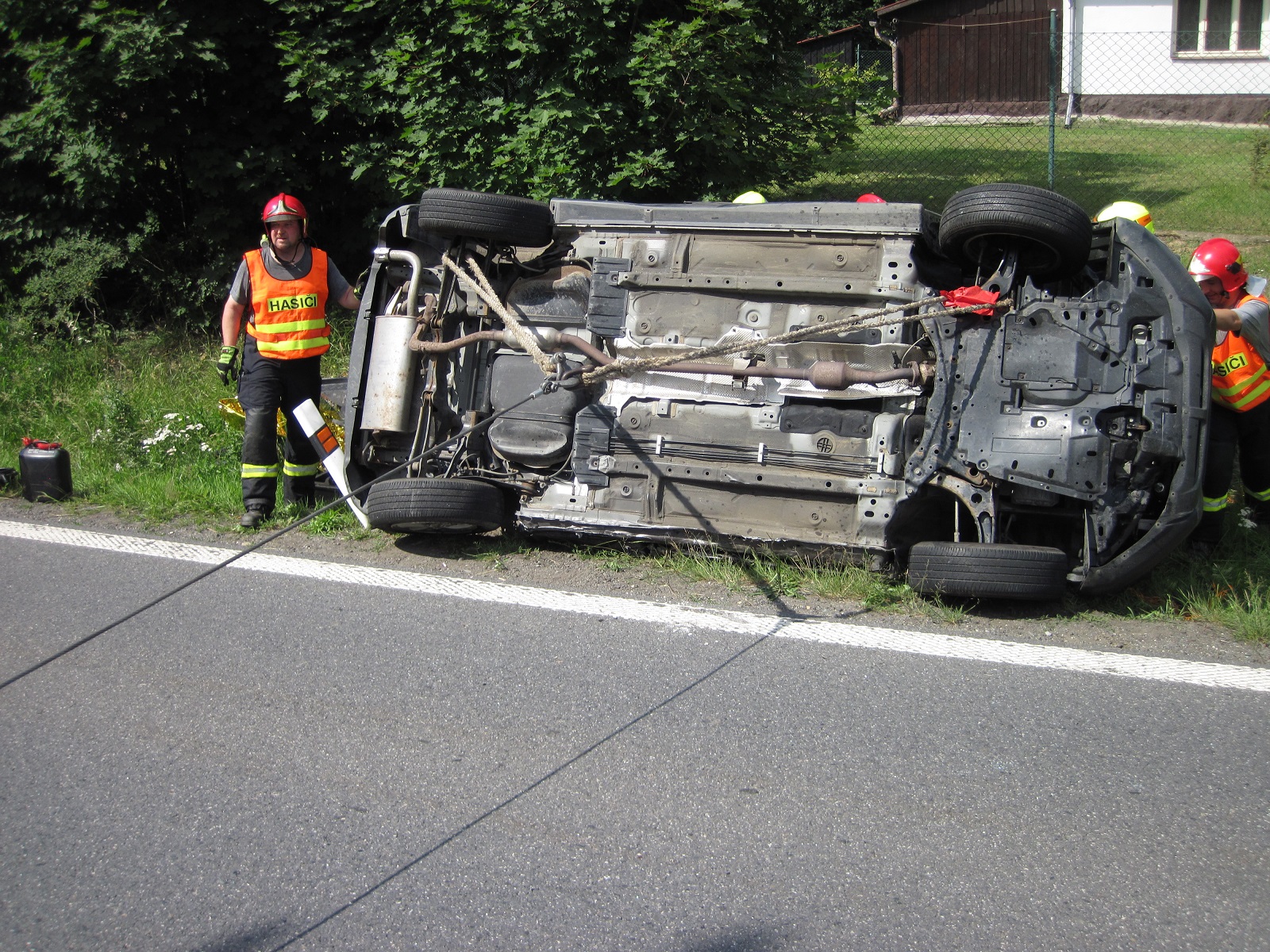 Z vozidla začal vytékat benzín, proto byl vůz po dohodě s policií převrácen zpět na kola. Uniklé provozní náplně byly zachyceny sorpční rohoží.