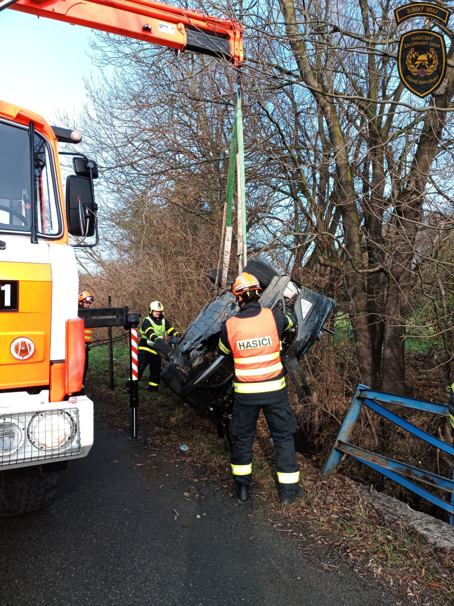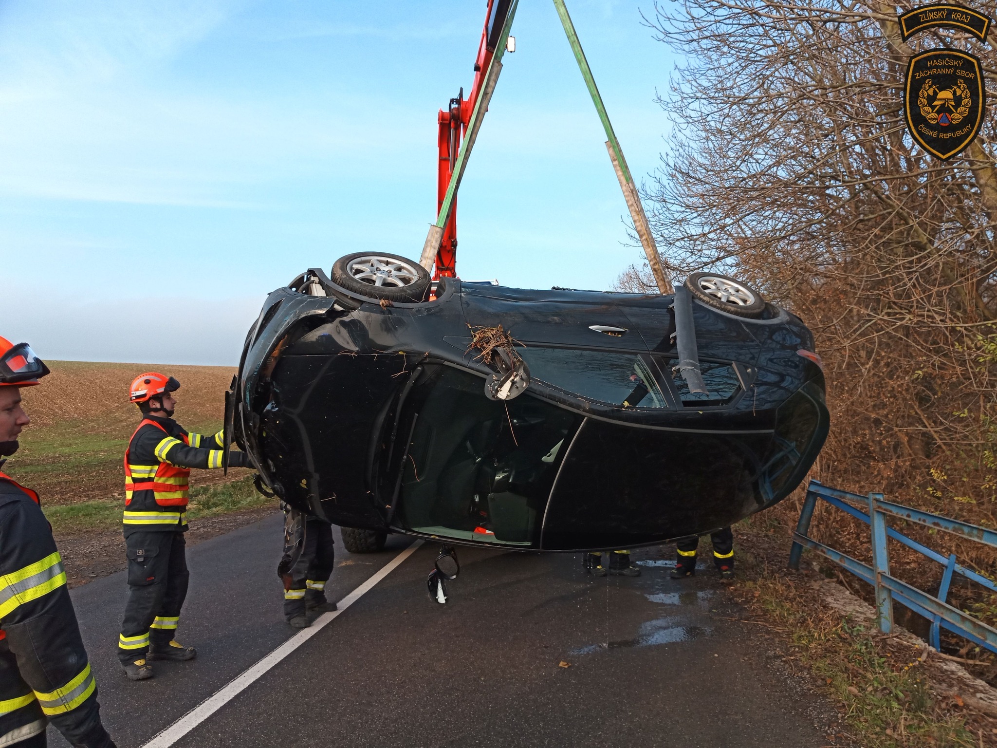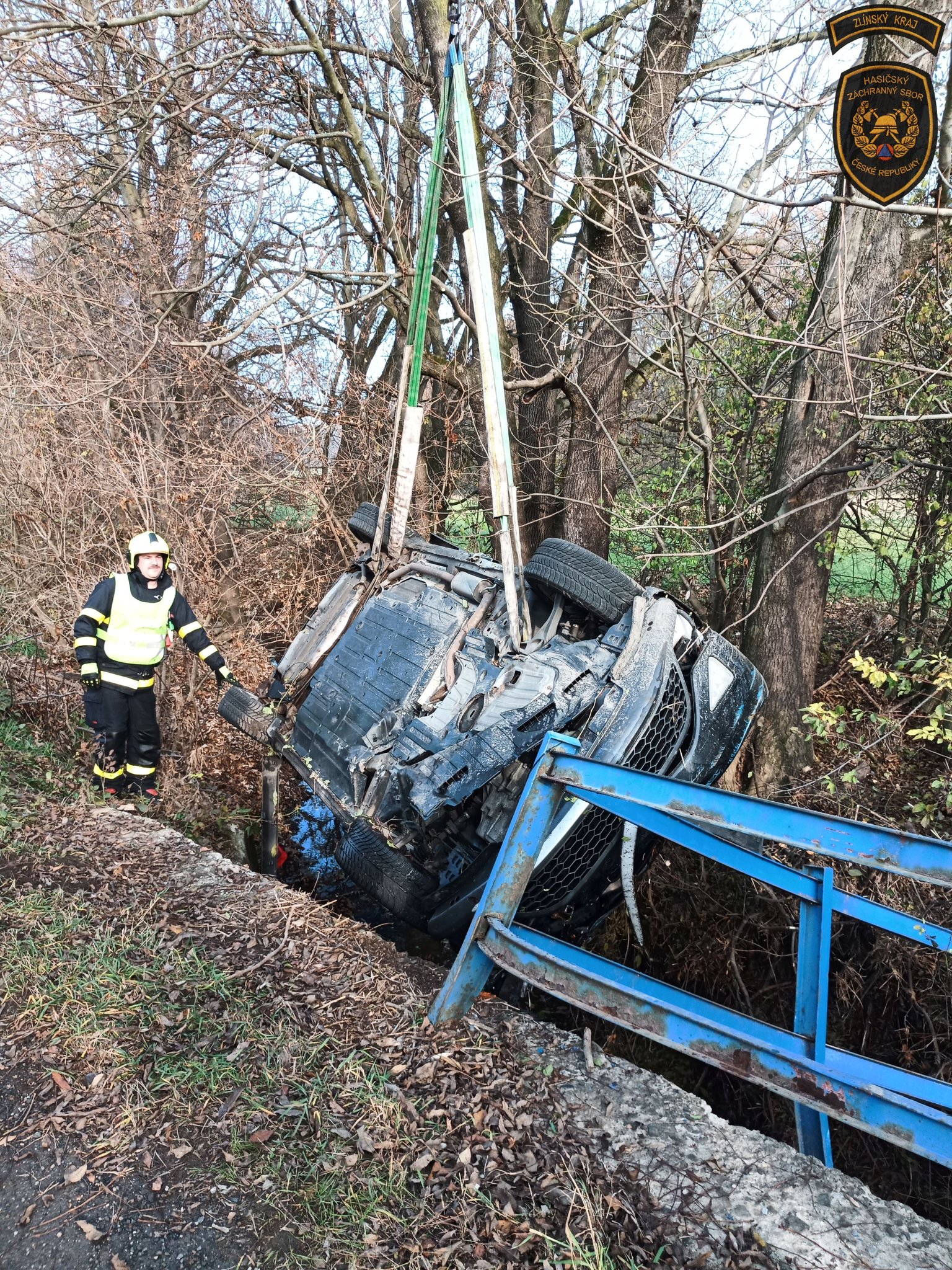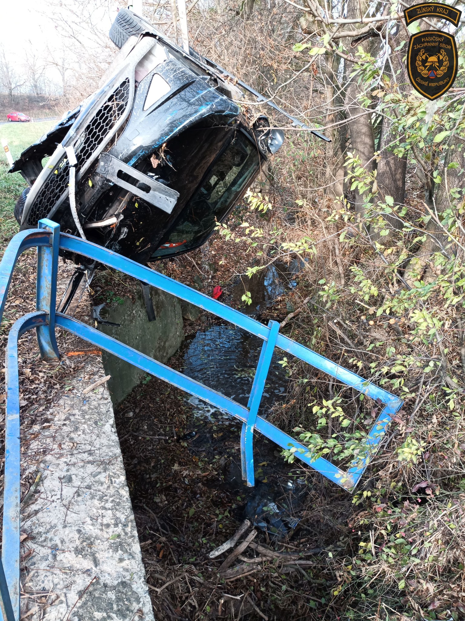 Pár minut po poledni vyjeli profesionální hasiči ze stanice Valašské Meziříčí k obci Lešná na Vsetínsku, kde řidič osobního vozidla Honda Civic prorazil zábradlí mostku a skončil s autem na střeše v korytě místního potoku. Řidiče si do péče vzala posádka zdravotnické záchranné služby.