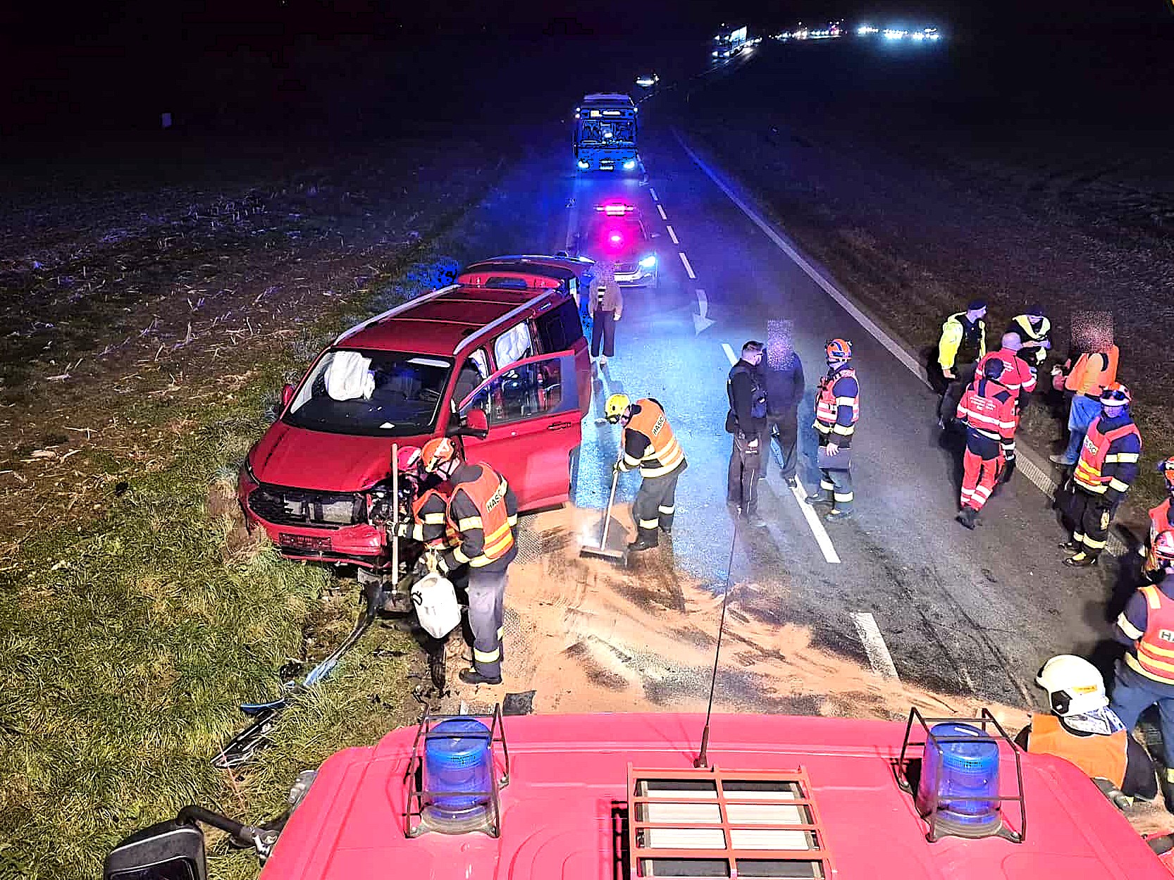 Prostor nehody bylo nutné nasvětlit, aby mohly všechny složky bezpečně pracovat. Po vyšetření nehody policisty pomáhali hasiči s naložením havarovaných vozidel na odtah a uklidili vozovku od trosek a kapalin. Postupně tak byl provoz opět obnoven.