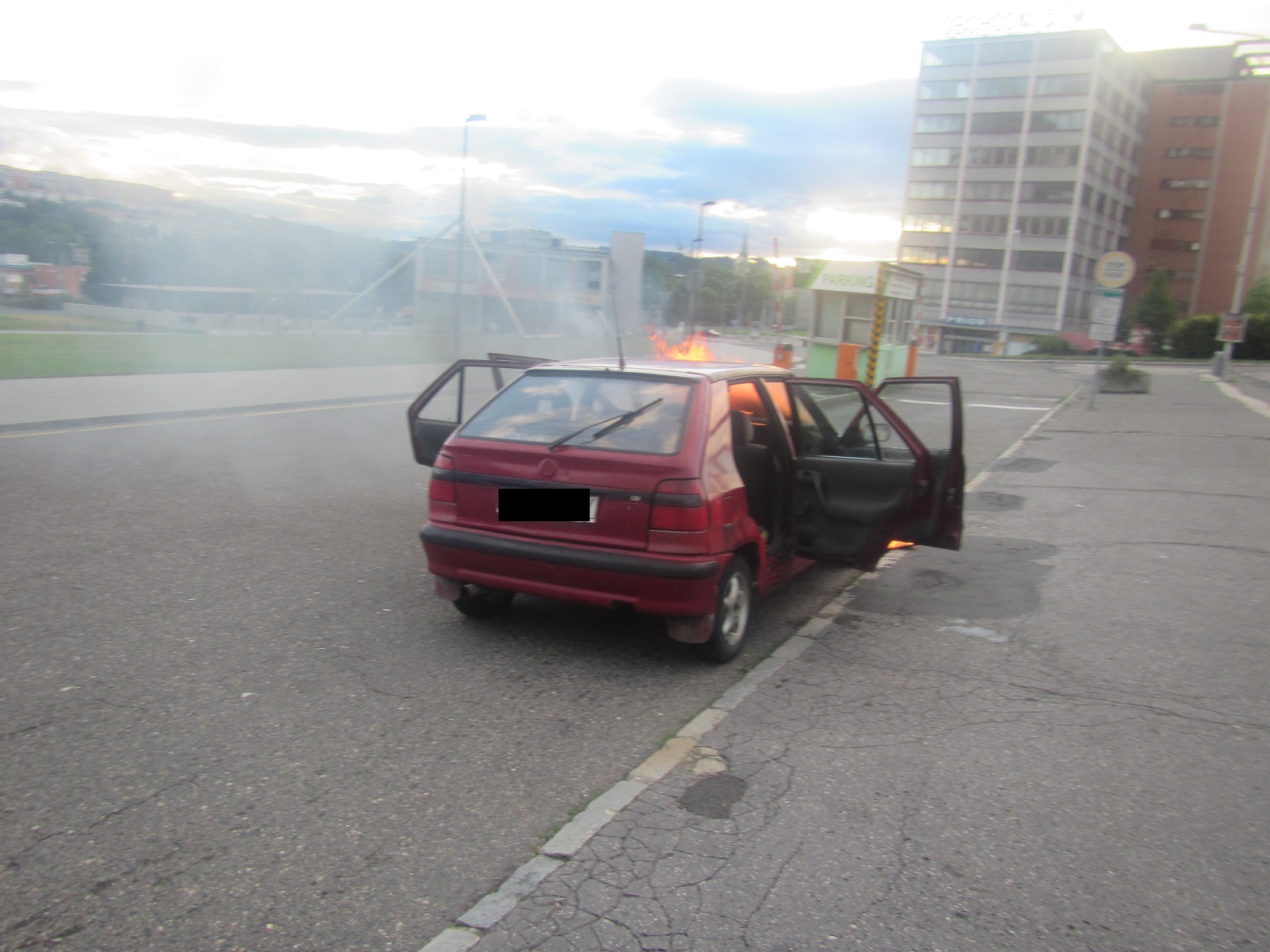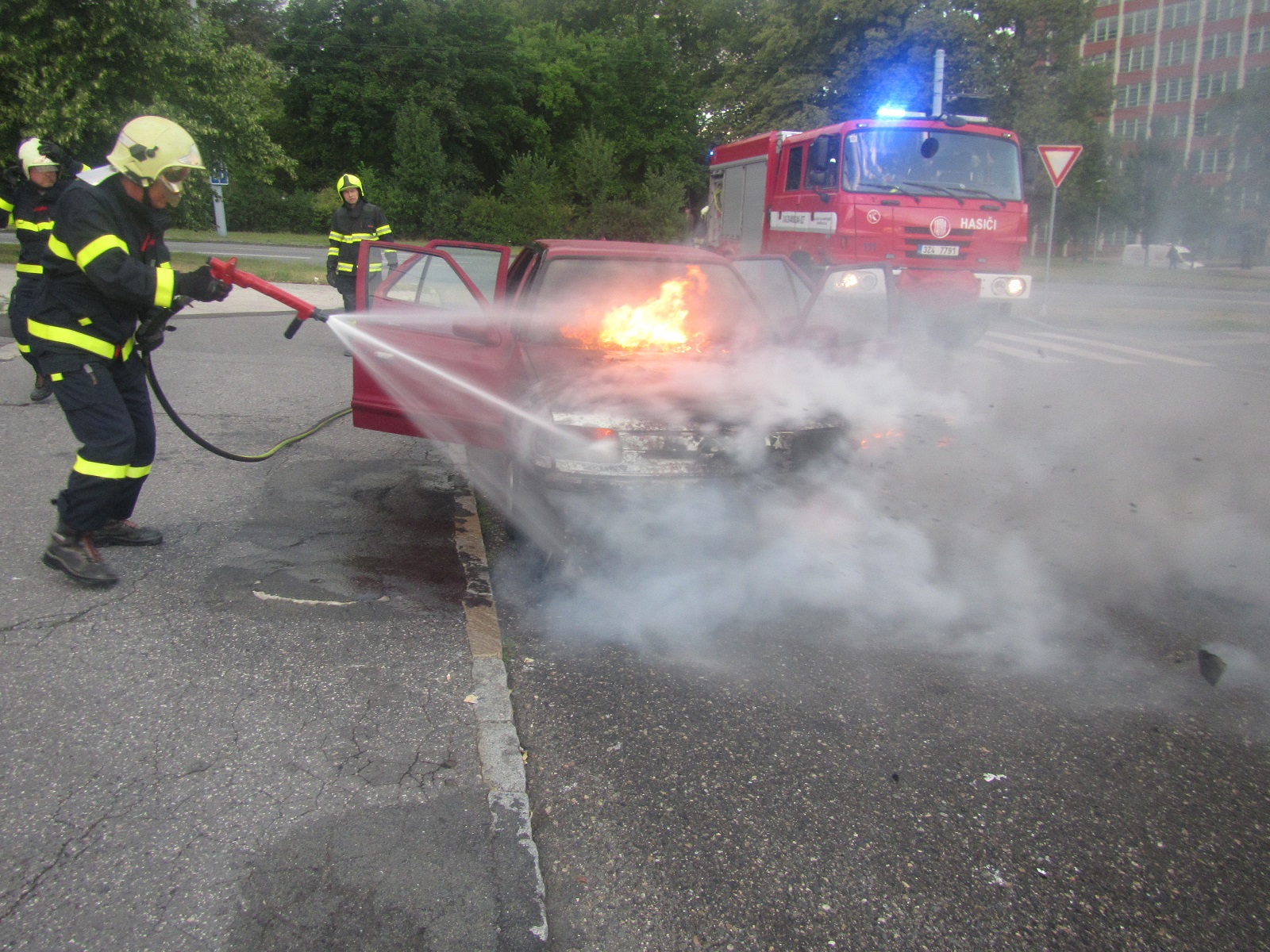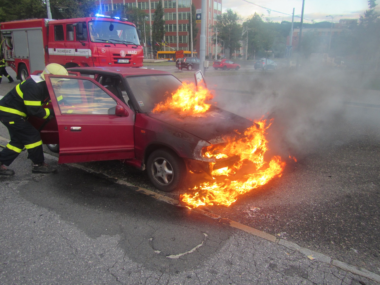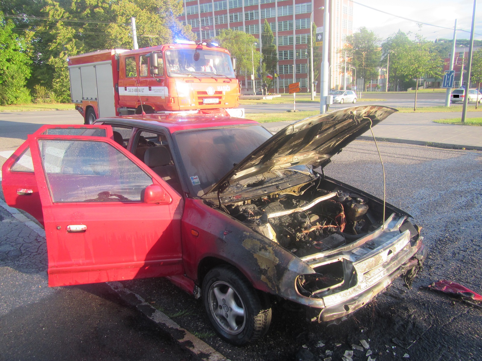 Hořící osobní vůz Škoda Felicia stál na příjezdové cestě parkovišti pod Velkým kinem. Ve voze nebyly žádné osoby. Hasiči požár uhasili jedním vysokotlakým proudem vody.