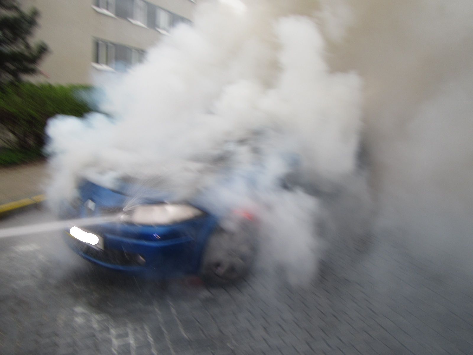 Jako první dorazili na místo hlášeného požáru v 07:40 hodin profesionální hasiči z centrální stanice Zlín. V dalších minutách se k nim připojili také hasiči jednotky města Zlína. I přes velmi rychlý příjezd na místo hasiči nemohli zabránit rozsáhlejšímu poškození vozidla. To bylo zasaženo intenzivním plamenným hořením v celé své přední části. Plameny se rychle rozšiřovaly i do interiéru auta. Hasiči pomocí vysokotlakého proudu postupně plameny srazili, dohasili jednotlivá místa hoření a celý zasažený prostor ochladili.