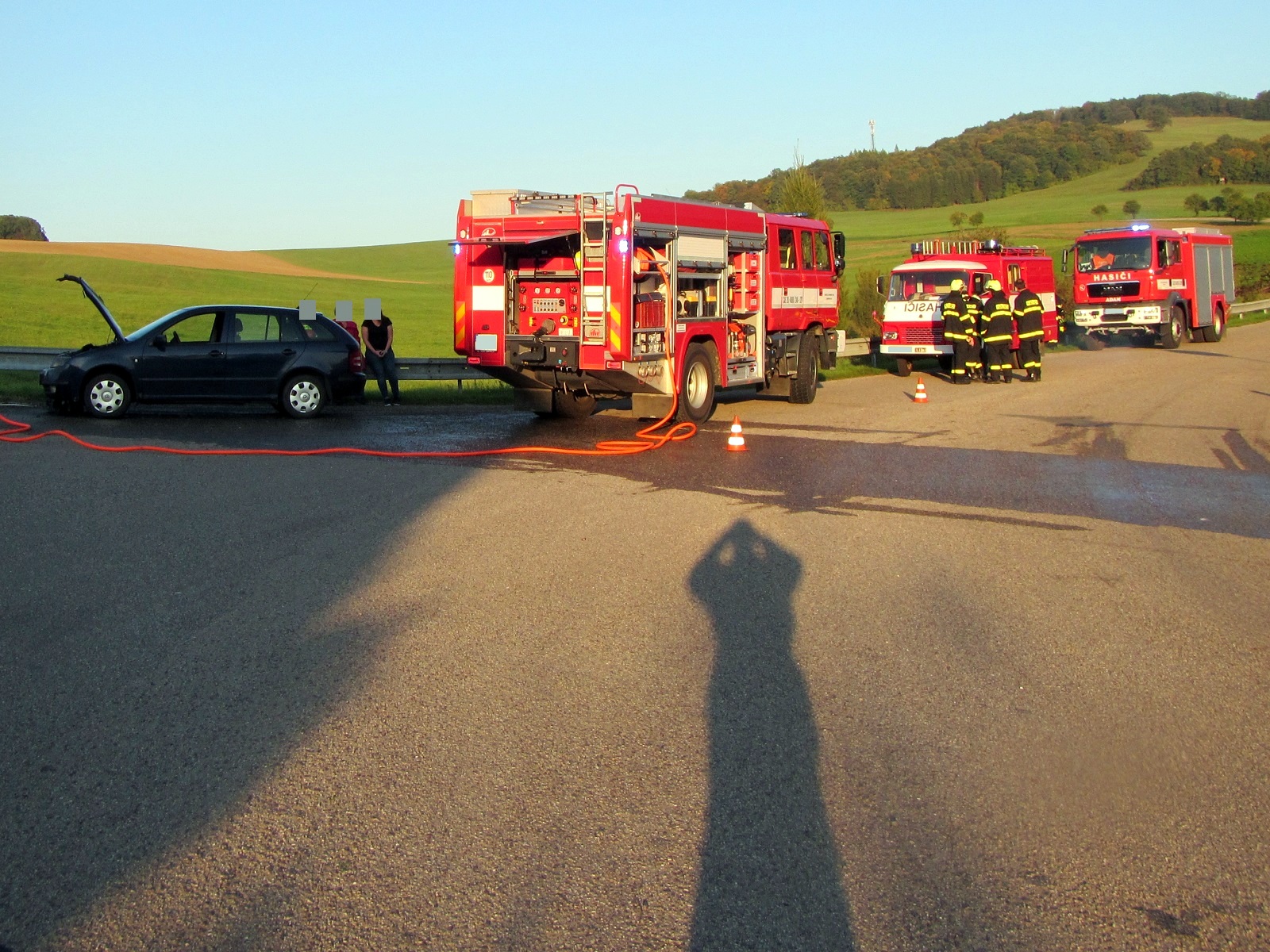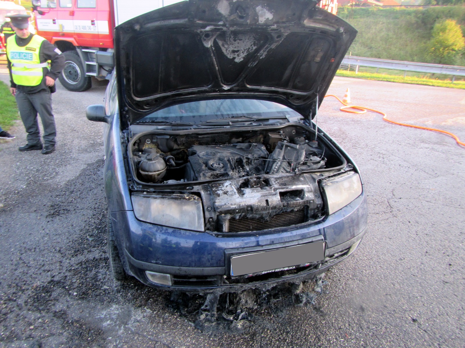 Jednalo se o požár v motorovém prostoru osobního automobilu Škoda Fabia. V době příjezdu hasičů se o uhašení plamenů snažili občané pomocí kbelíků s vodou, čímž rozvoj požáru značně utlumili. Jednotka profesionálních hasičů po příjezdu natáhla jeden vysokotlaký proud a požár postupně zlikvidovala. Řidička i její pes vyvázli bez zranění.
