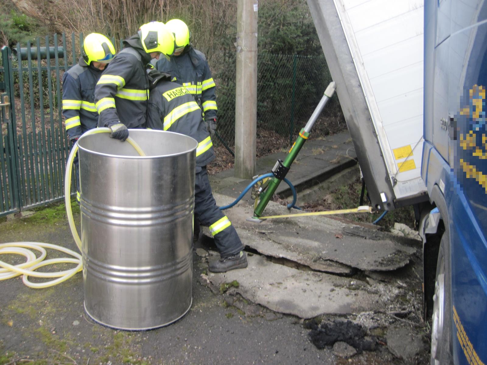 Aby nedošlo k velkému úniku nafty do půdy a ohrožení tak životního prostředí, pomocí membránového a elektrického čerpadla odčerpali hasiči z kamionu do záchytné nádoby téměř 400 litrů nafty.