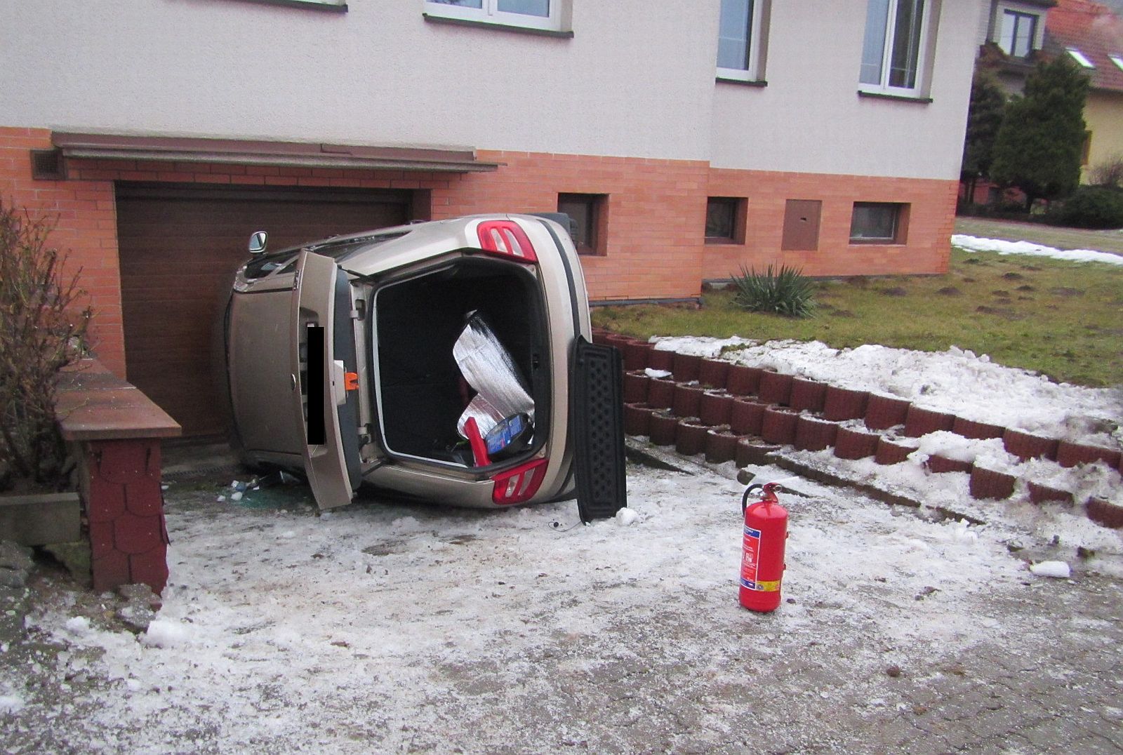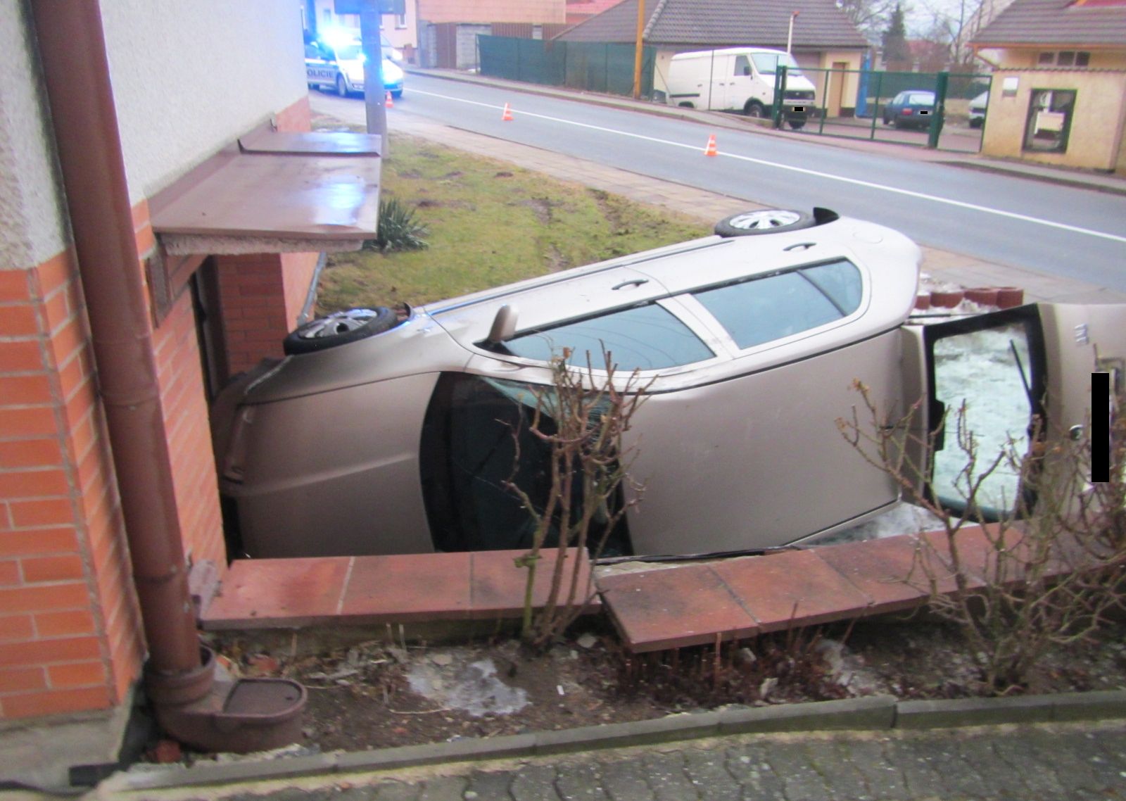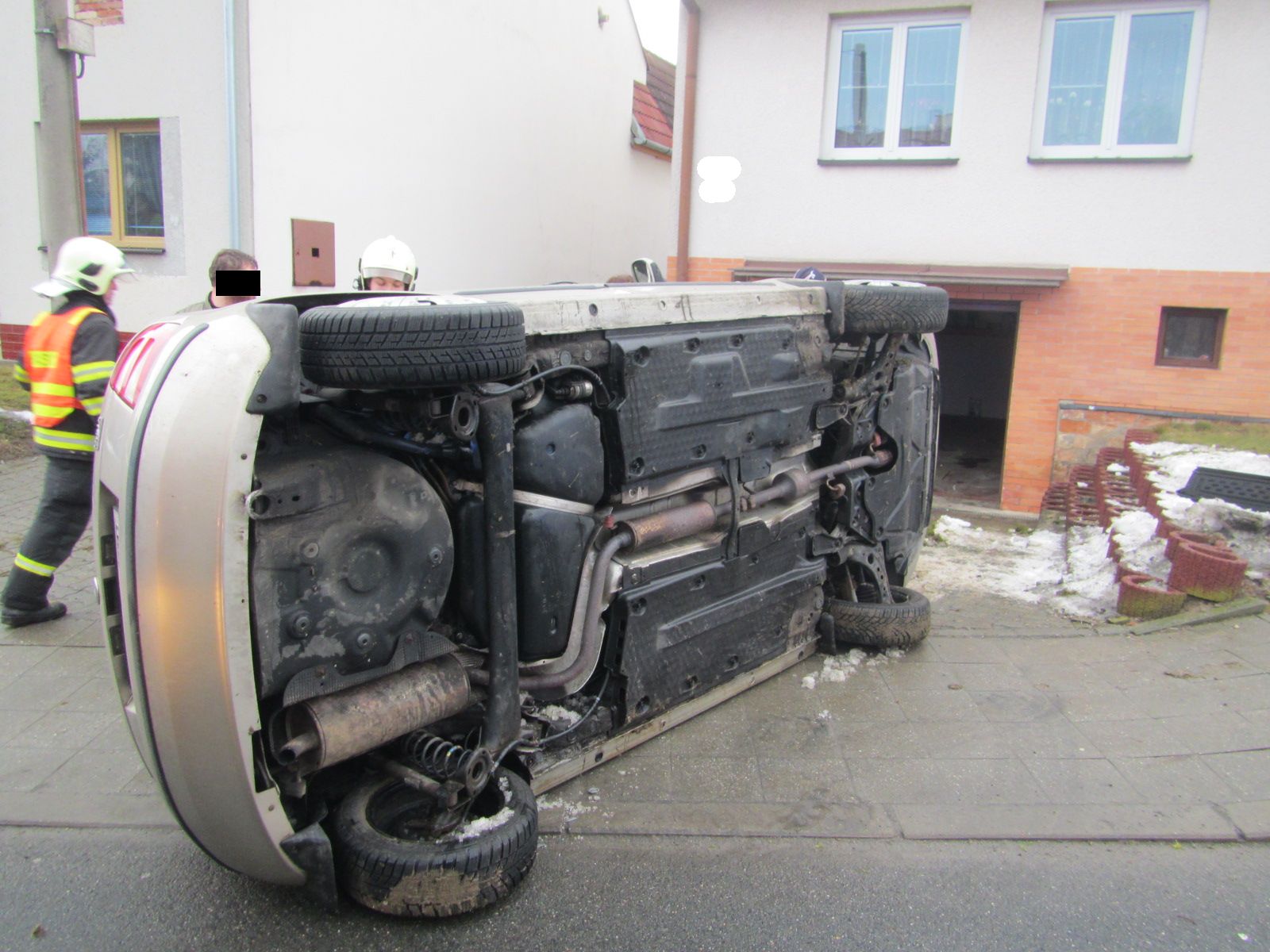 Informaci o dopravní nehodě osobního vozidla zn. Škoda Felicia, které vyjelo na chodník a převrátilo se do vjezdu ke garáži rodinného domu, přijali profesionální hasiči ve středu 22.2 2017 v 06: 46 hodin.