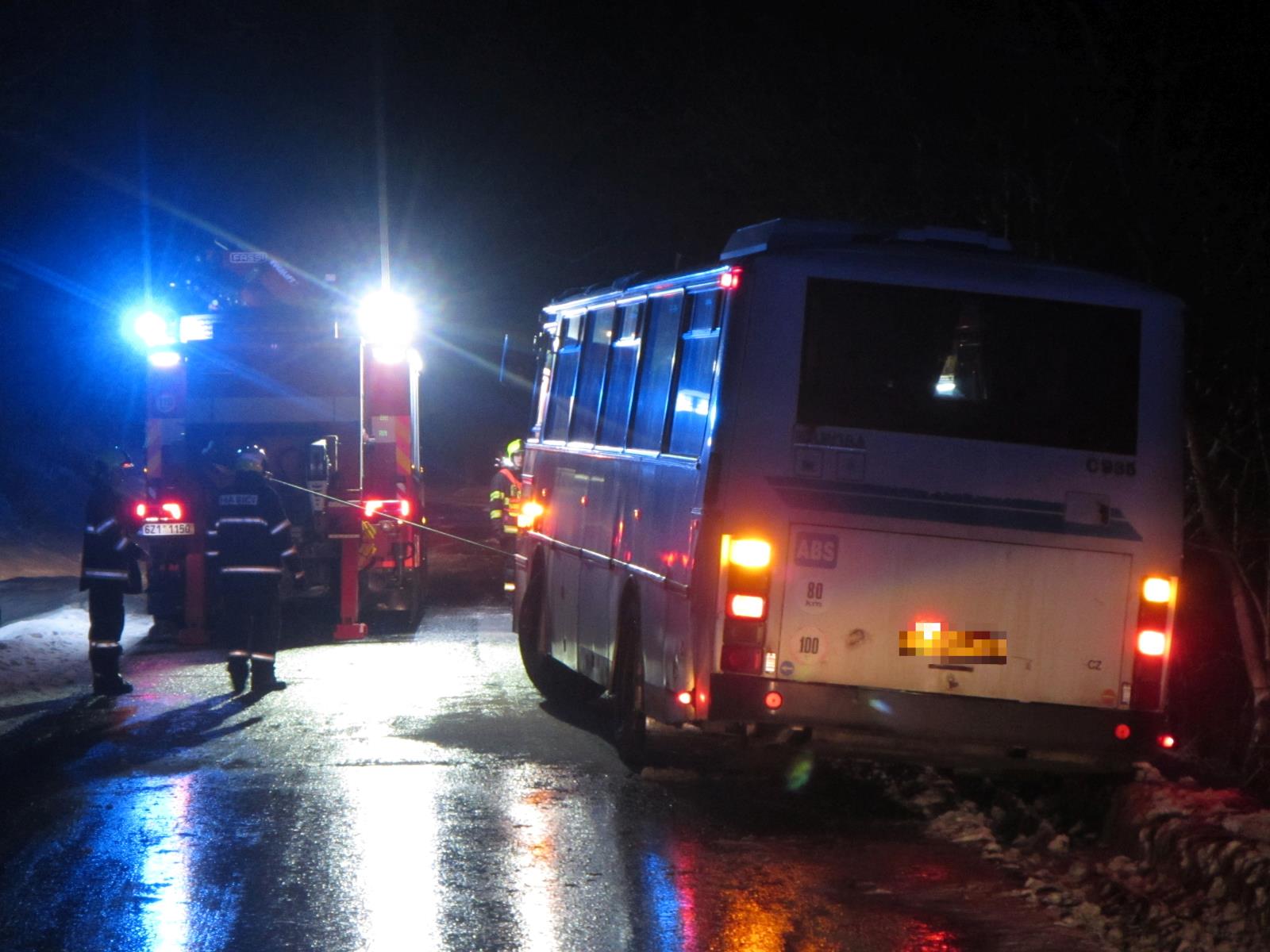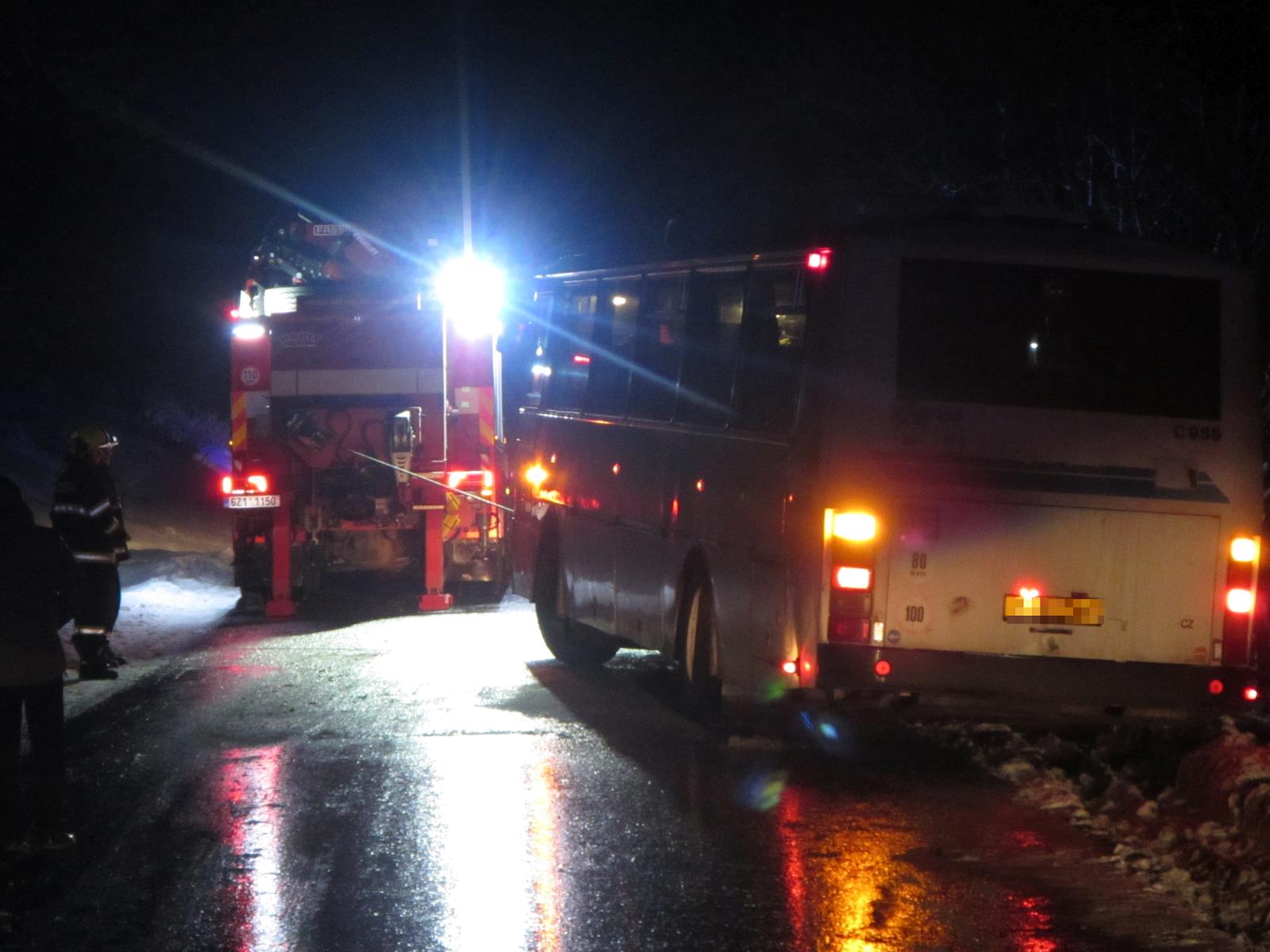 Situaci na místě velmi komplikoval čerstvě napadlý sníh na namrzlé vozovce a to, že se autobus nakláněl směrem do pole a hrozilo jeho převrácení. Nakonec se hasičům podařilo s využitím vyprošťovacího automobilu bezpečně autobus ze sněhu dostat zpět na cestu. Poté se cestující mohli vrátit zpět do vozidla a pokračovat dál v jízdě. Před půlnocí se obě jednotky vrátily zpět na své stanice.