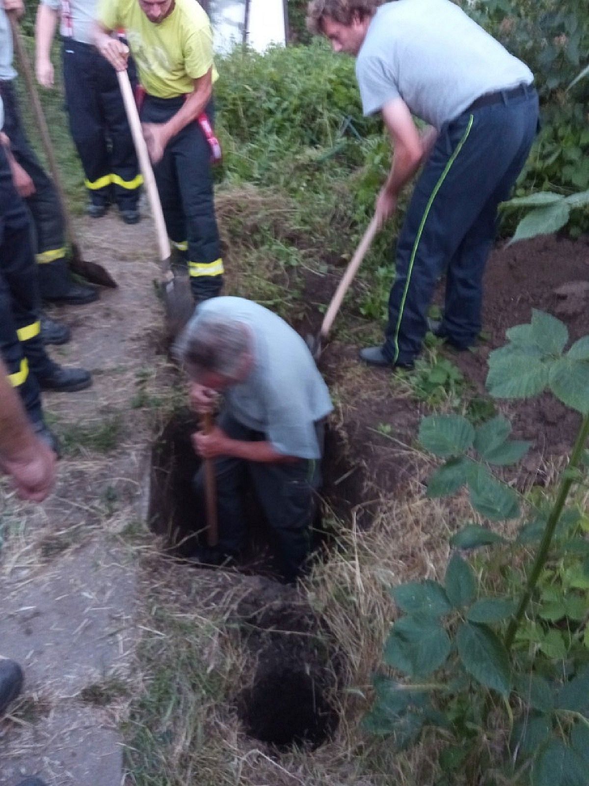 Profesionální hasiči z Uherského Hradiště a ze Zlína a také dobrovolní hasiči ze Starého Města se postupně vystřídali při kopání...