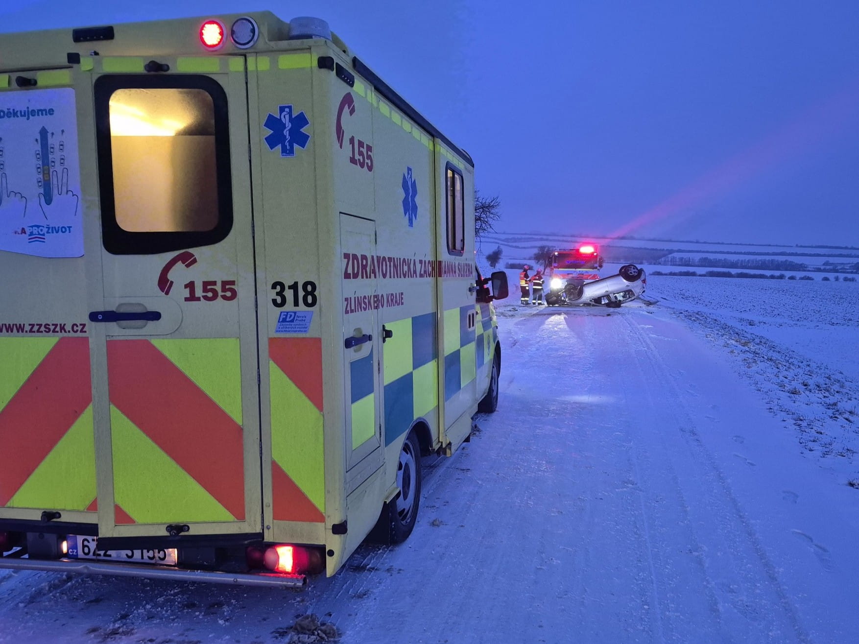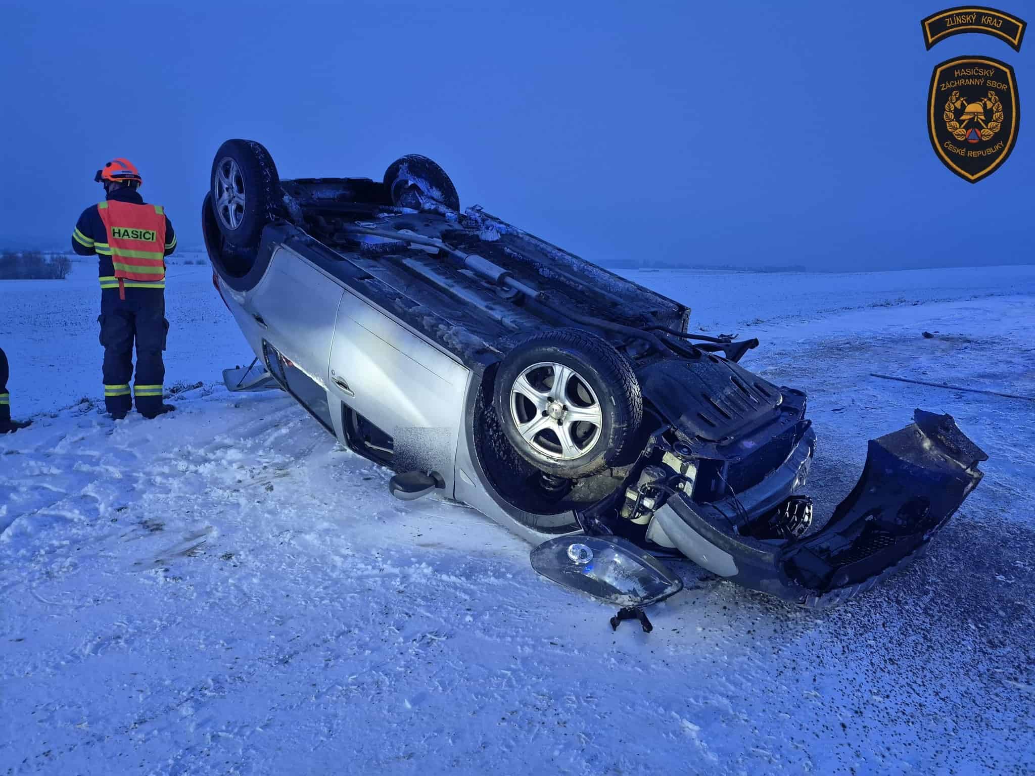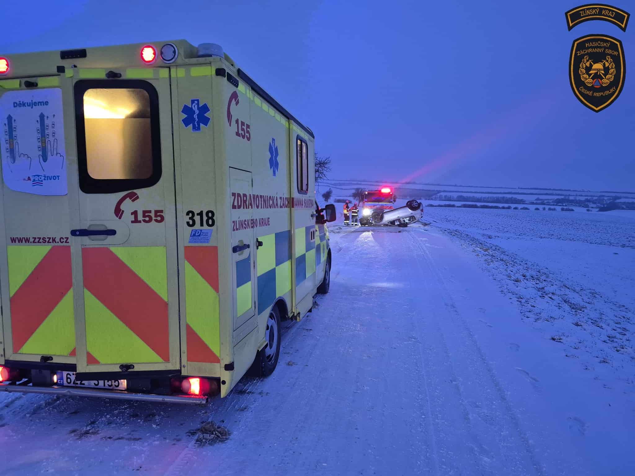 Ranní zimní podmínky dnes opět ukázaly svou nebezpečnost na silnicích. Mezi Popovicemi a Zlobicemi havarovalo osobní vozidlo, které se převrátilo na střechu a zablokovalo oba jízdní pruhy. Na místo byla vyslána jednotka profesionálních hasičů z Kroměříže.