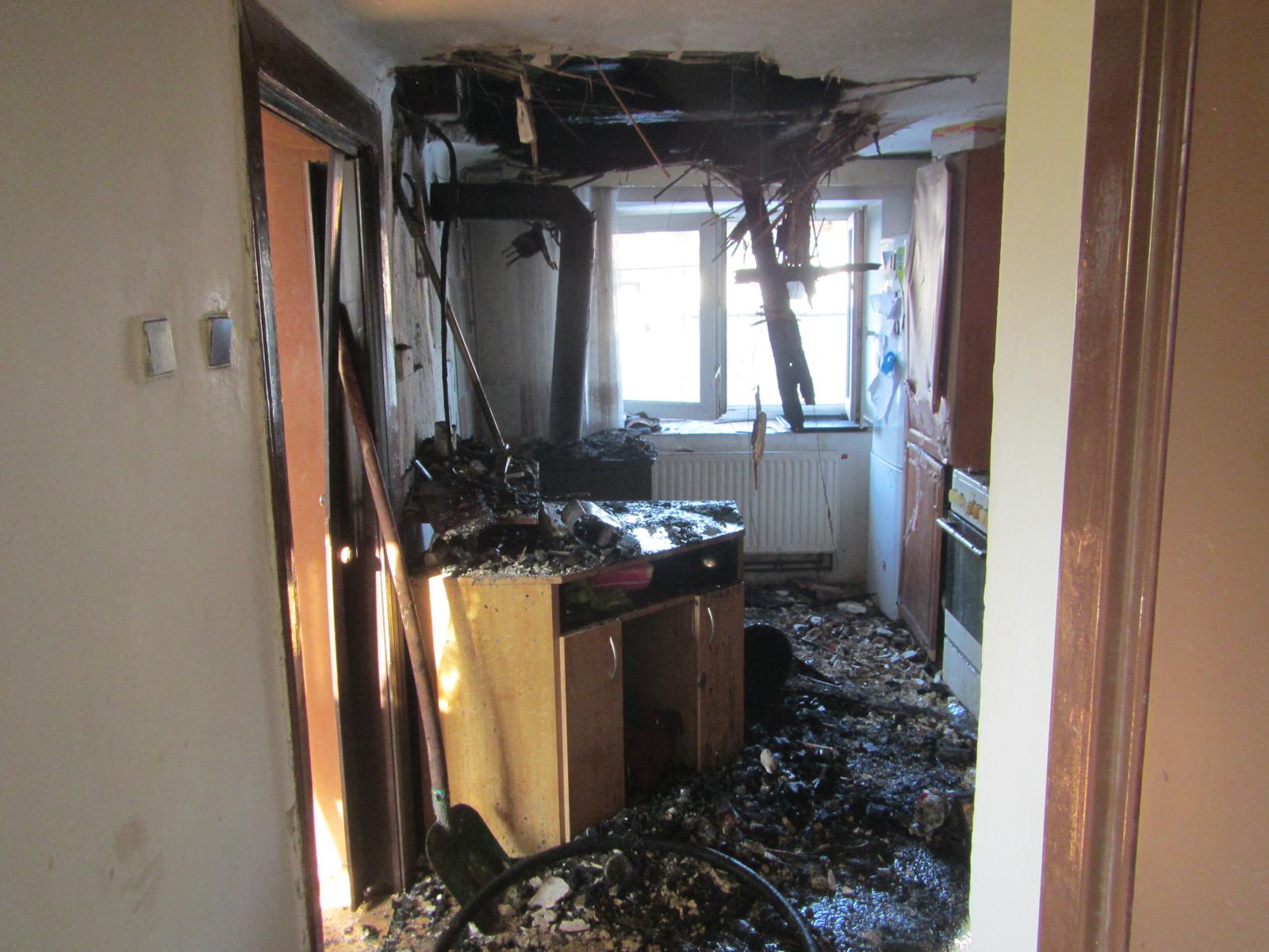 Hasiči vyklidili i místnost přilehlou ke kuchyni, aby nedošlo k poškození nábytku při rozebírání stropu.