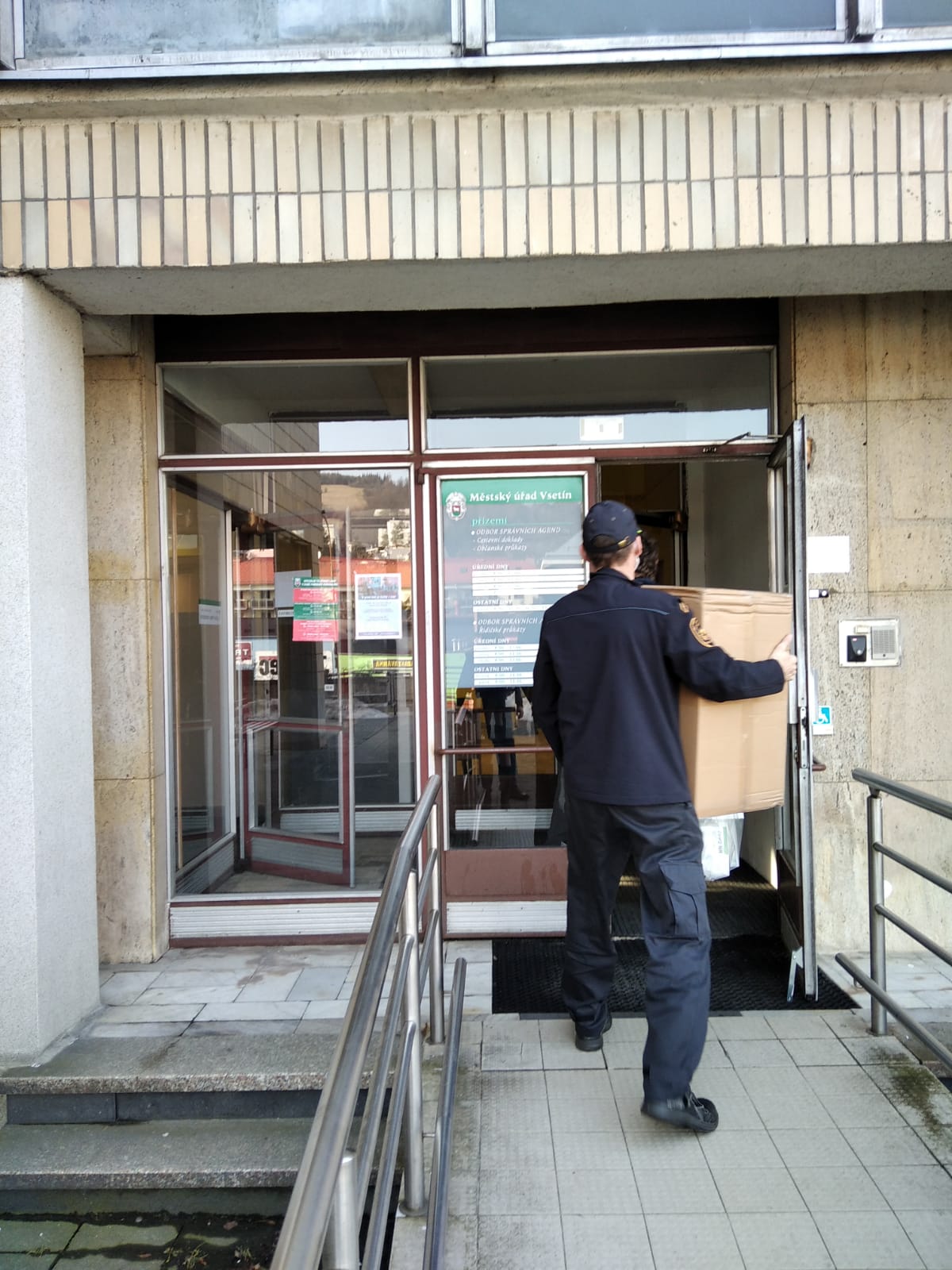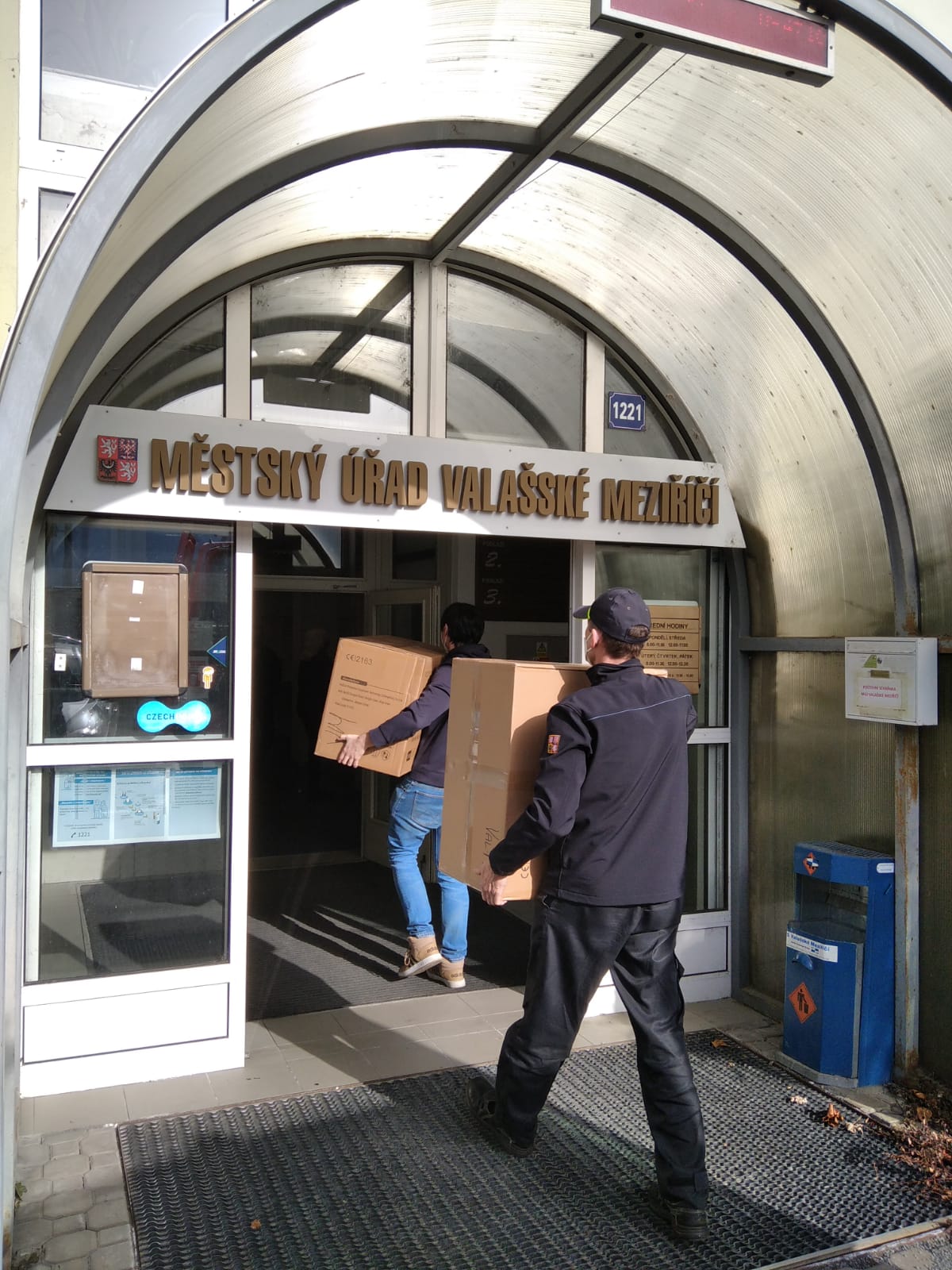 Profesionální hasiči Hasičského záchranného sboru Zlínského kraje dnes krátce po osmé hodině ranní přistavili svá vozidla u budovy Krajského úřadu Zlínského kraje a do vozidel naložili balíky plné respirátorů. Poté se rozjeli do všech výdejních míst v kraji, kterými jsou obce s rozšířenou působností, kde svůj náklad postupně vyložili.