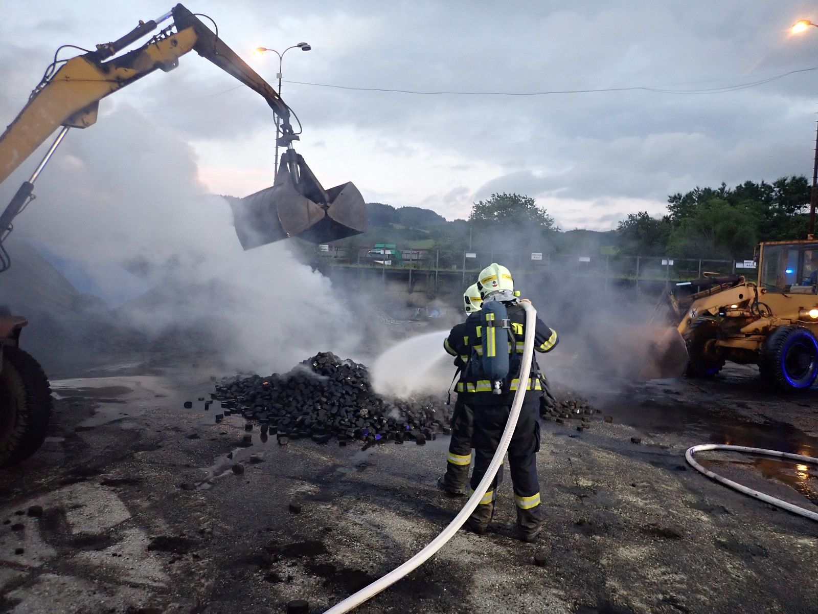 Hořící hromadu briket hasili hasiči s pomocí zaměstnanců firmy